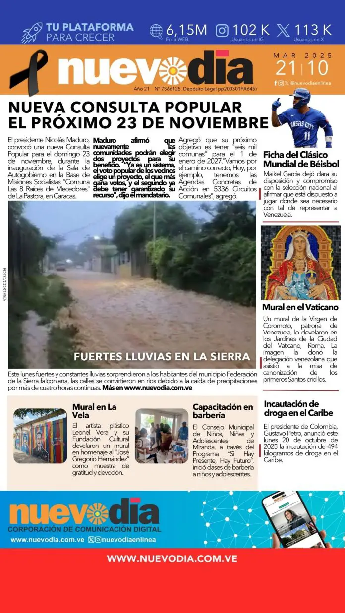 InicioPortadas Portadas Portada del 21 de octubre de 2025 21/10/2025 FacebookTwitterPinterestWhatsApp Cuota FacebookTwitterPinterestWhatsApp Artículo anteriorMás de cuatro horas de lluvias ininterrumpidas se registran en el municipio FederaciónArtículo siguienteEdicto.José Vicente Pérez Borjas. Josmary EscalonaPeriodista principalmente de la fuente política que también hace diarismo, entrevistas y trabajos especiales sobre temas que la población desea conocer. Noticias Relacionadas Portadas Primera lunes 20 de octubre de 2025 Portadas Portada viernes 17 de octubre de 2025 Portadas Portada del 16 de octubre de 2025 Redes Sociales20,299FansMe gusta112,425SeguidoresSeguir4,600SuscriptoresSuscribirte Últimas noticias Destacadas Venezuela asume vicepresidencia de la Organización Internacional de Mediación Destacadas Mural de la Virgen de Coromoto es develado en los jardines del Vaticano Cargar más