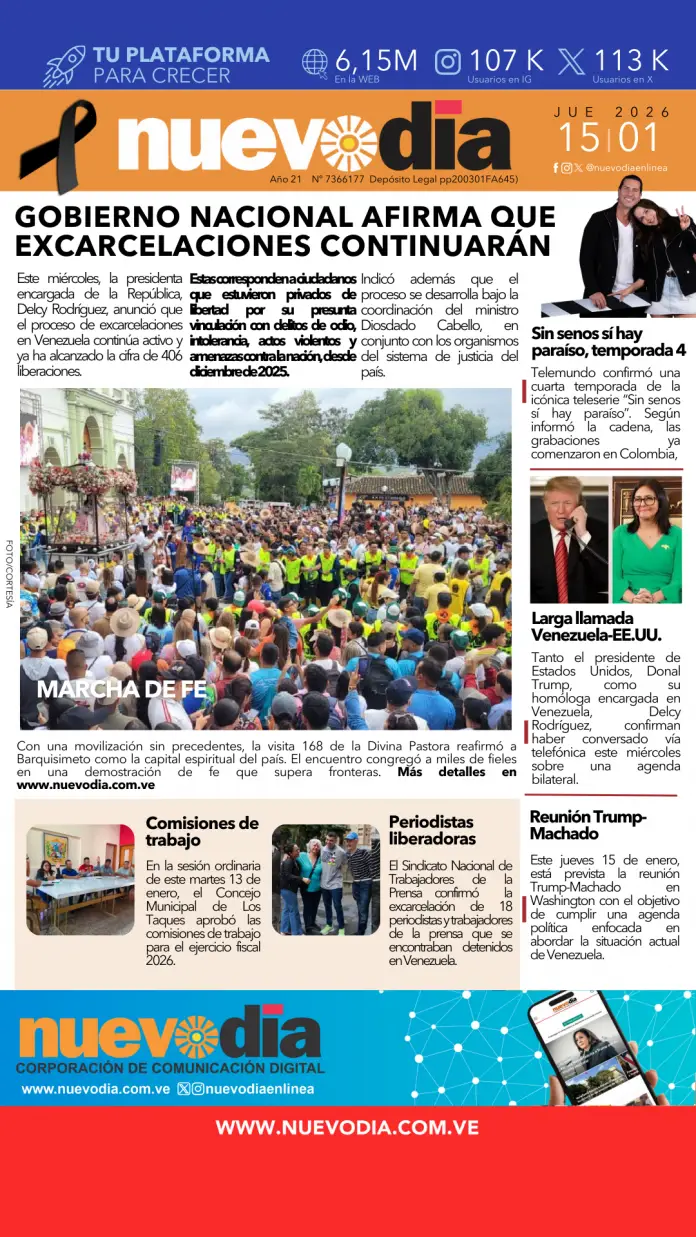 InicioPortadas Portadas Portada del jueves 15 de enero de 2026 15/01/2026 FacebookTwitterPinterestWhatsApp Cuota FacebookTwitterPinterestWhatsApp Artículo anteriorExcarcelaciones en Venezuela | Suman 406 liberados y «se mantiene abierto» Laura ArismendiEl periodismo...mi forma de vida. Noticias Relacionadas Portadas Portada miércoles 14 de enero de 2026 Portadas Portada martes 13 de enero de 2026 Portadas Portada lunes 12 de enero de 2026 Redes Sociales20,299FansMe gusta112,425SeguidoresSeguir4,600SuscriptoresSuscribirte Últimas noticias Destacadas Excarcelaciones en Venezuela | Suman 406 liberados y «se mantiene abierto» Destacadas Visita 168 de la Divina Pastora, desborde de fe en Venezuela Cargar más