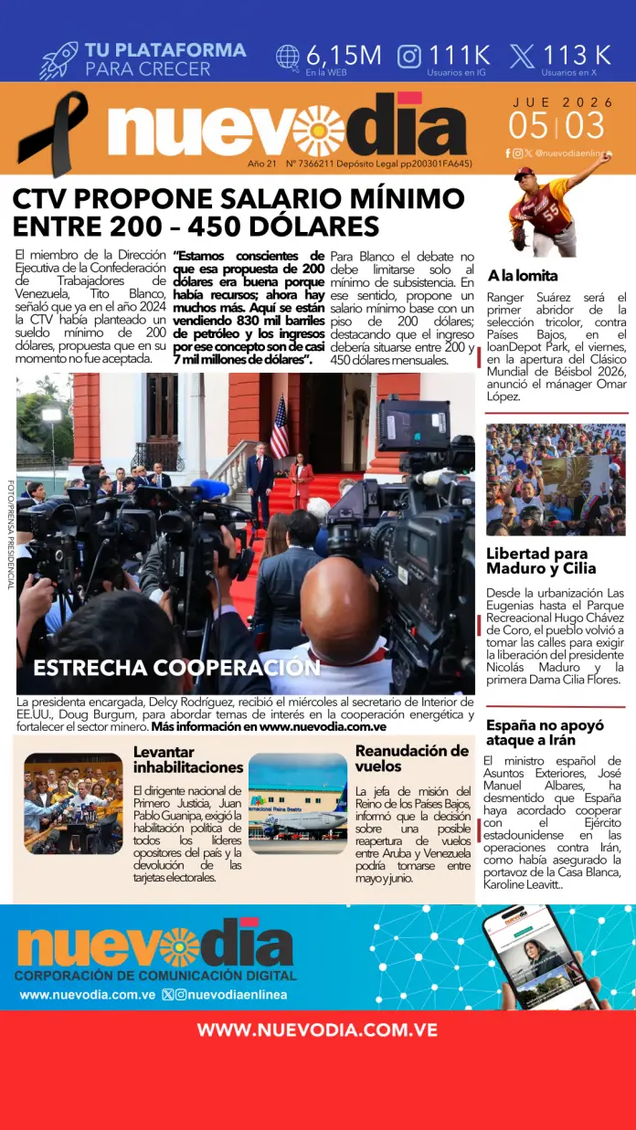 InicioPortadas Portadas Portada jueves 05 de marzo de 2026 05/03/2026 FacebookTwitterPinterestWhatsApp Cuota FacebookTwitterPinterestWhatsApp Artículo anteriorPresidenta encargada entregará a la AN una ampliación de la Ley de Minas Yaneth Chacon Noticias Relacionadas Portadas Primera 04 de Marzo de 2026 Portadas Portada martes 3 de marzo de 2026 Portadas Portada sábado 28 de febrero de 2026 Redes Sociales20,299FansMe gusta112,425SeguidoresSeguir4,600SuscriptoresSuscribirte Últimas noticias Destacadas Presidenta encargada entregará a la AN una ampliación de la Ley de Minas Destacadas Guanipa pide levantar inhabilitaciones a toda la dirigencia opositora Cargar más