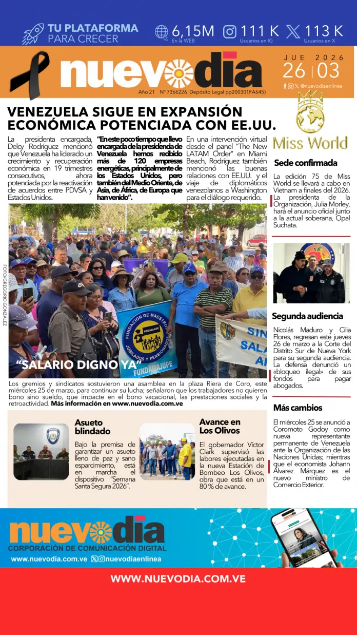 InicioPortadas Portadas Portada jueves 26 de marzo de 2026 26/03/2026 FacebookTwitterPinterestWhatsApp Cuota FacebookTwitterPinterestWhatsApp Artículo anteriorVenezuela lidera el crecimiento regional con 19 trimestres de expansión Yaneth Chacon Noticias Relacionadas Portadas Primera del 25 de marzo de 2026 Portadas Portada martes 24 de marzo de 2026 Portadas Portada lunes 23 de marzo de 2026 Redes Sociales20,299FansMe gusta112,425SeguidoresSeguir4,600SuscriptoresSuscribirte Últimas noticias Destacadas Venezuela lidera el crecimiento regional con 19 trimestres de expansión Destacadas PDVSA denuncia campaña difamatoria con caso PSOE Cargar más