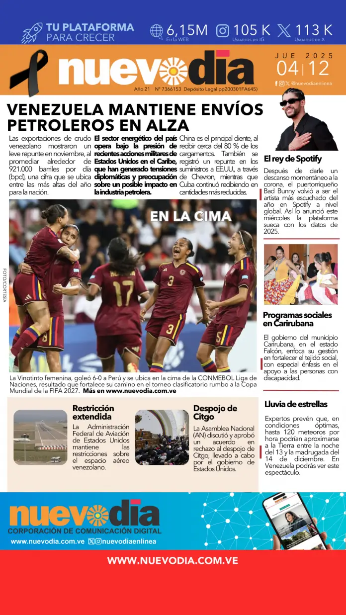 InicioPortadas Portadas Portada jueves 4 de diciembre de 2025 04/12/2025 FacebookTwitterPinterestWhatsApp Cuota FacebookTwitterPinterestWhatsApp Artículo anteriorCartel de Notificación.Brahiams Josue Partidas Garcés. Yaneth Chacon Noticias Relacionadas Portadas Portada del 3 de diciembre de 2025 Portadas Portada martes 2 de diciembre de 2025 Portadas Portada del 1 de diciembre de 2025 Redes Sociales20,299FansMe gusta112,425SeguidoresSeguir4,600SuscriptoresSuscribirte Últimas noticias Destacadas Maduro: La defensa del Esequibo es una victoria del pueblo venezolano Destacadas Venezuela mantiene envíos petroleros por encima de 900.000 bpd pese a tensiones con EE. UU. Cargar más