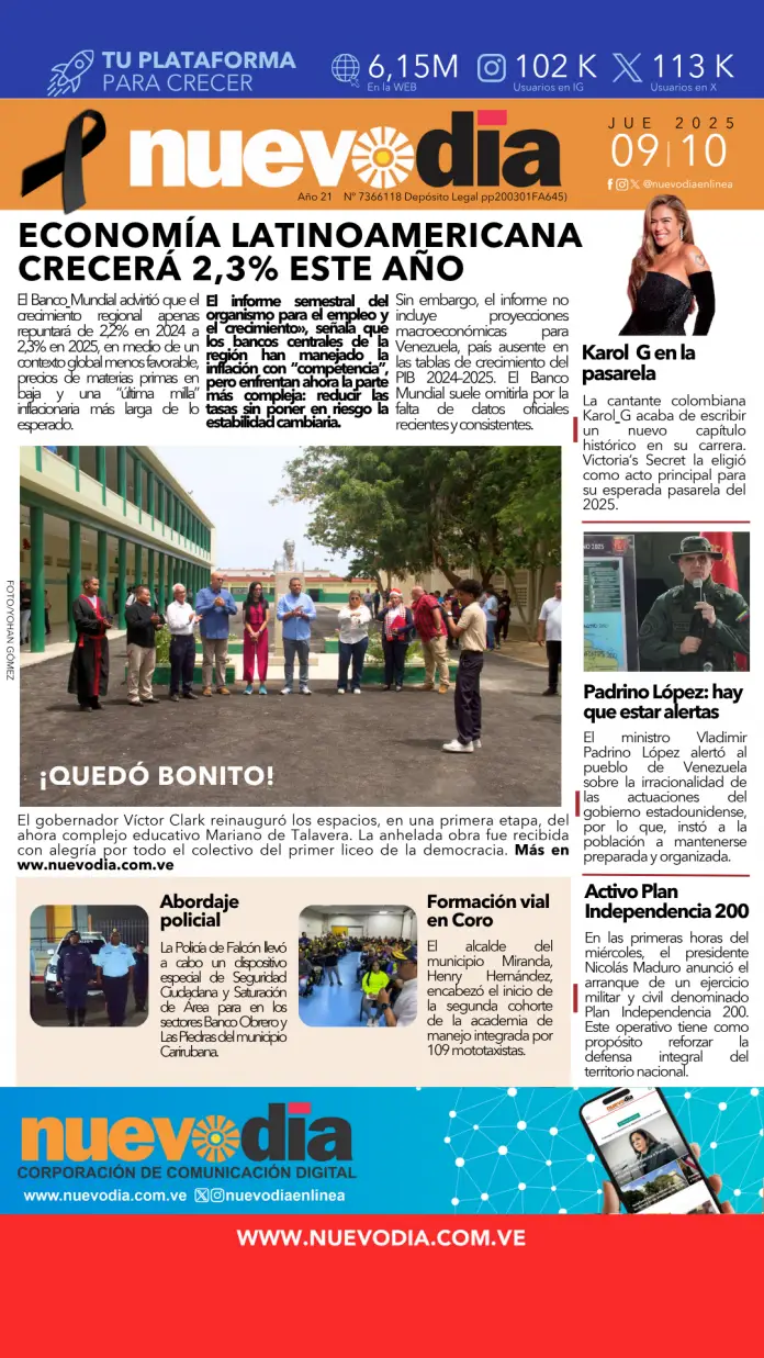 InicioPortadas Portadas Portada jueves 9 de octubre de 2025 09/10/2025 FacebookTwitterPinterestWhatsApp Cuota FacebookTwitterPinterestWhatsApp Artículo anteriorAgredió a su hijastro por negarse a darle dinero Laura ArismendiEl periodismo...mi forma de vida. Noticias Relacionadas Portadas Portada del 08 de octubre de 2025 Portadas Portada martes 7 de octubre de 2025 Portadas Portada viernes 3 de octubre de 2025 Redes Sociales20,299FansMe gusta112,425SeguidoresSeguir4,600SuscriptoresSuscribirte Últimas noticias Destacadas Conviasa activará ruta entre Venezuela, China y Rusia Destacadas Entérate | Activo Plan Independencia 200 desde hoy 8-Oct Cargar más