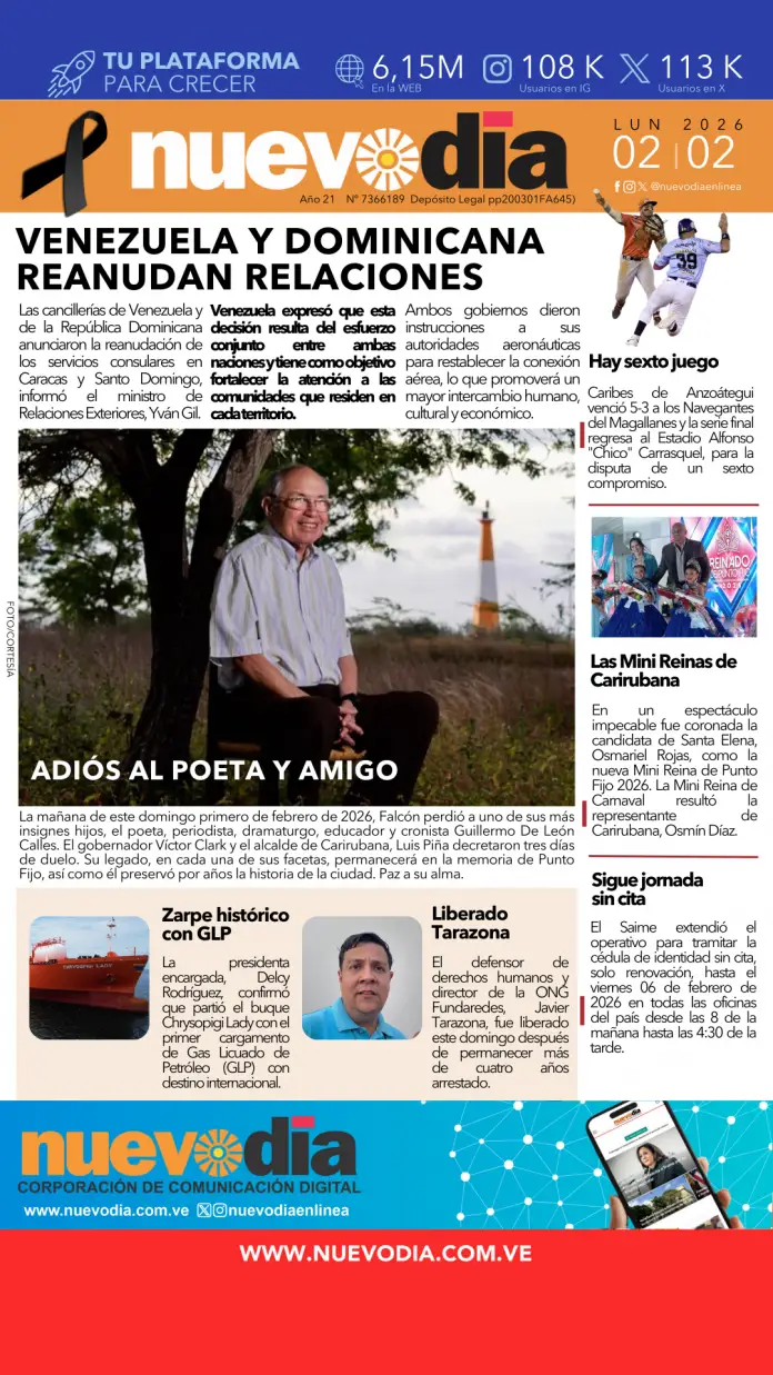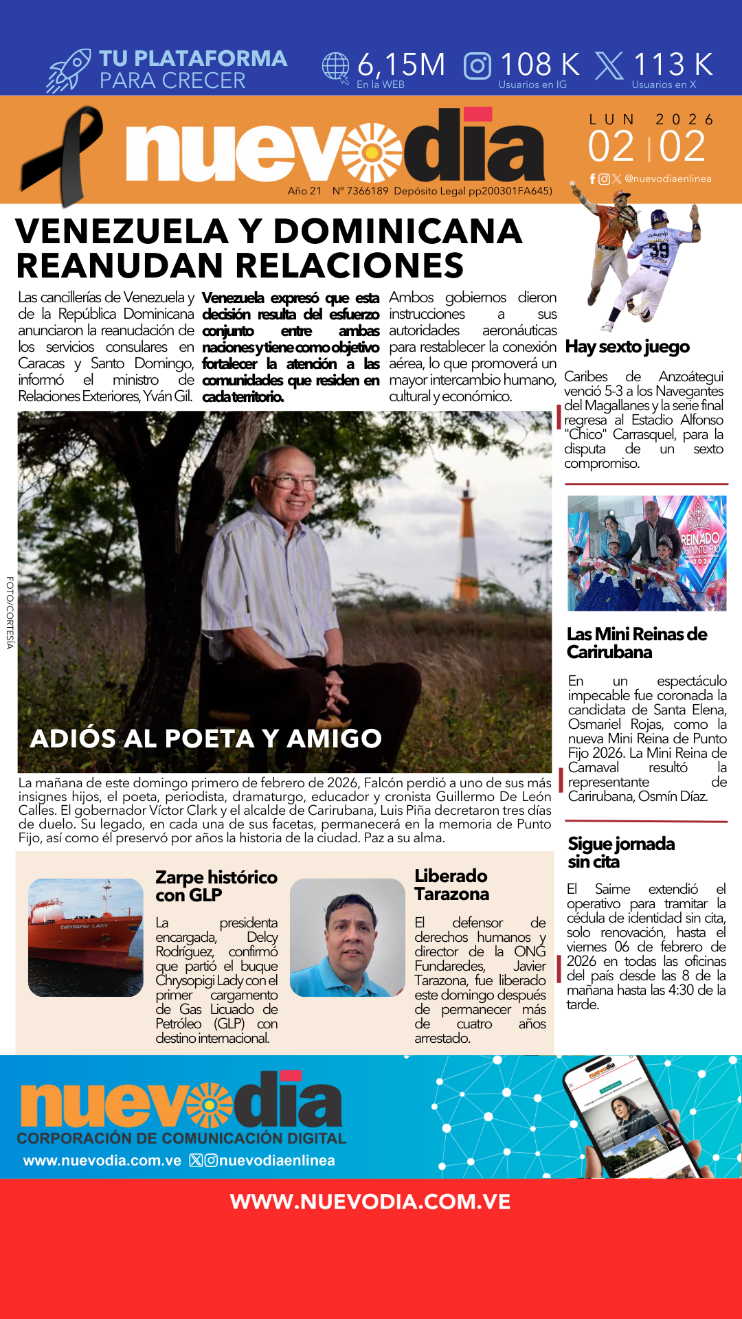 InicioPortadas Portadas Portada lunes 02 de febrero de 2026 02/02/2026 FacebookTwitterPinterestWhatsApp Cuota FacebookTwitterPinterestWhatsApp Artículo anteriorCaribes emboscó a Magallanes y la final de la LVBP 25-26 regresa a Puerto La Cruz Yaneth Chacon Noticias Relacionadas Portadas Portada viernes 29 de enero de 2026 Portadas Portada jueves 29 de enero de 2026 Portadas Portada miércoles 28 de enero de 2026 Redes Sociales20,299FansMe gusta112,425SeguidoresSeguir4,600SuscriptoresSuscribirte Últimas noticias Nacionales Excarcelado Roalmi Cabeza, escolta de María Corina Machado Nacionales Asignan nueva responsabilidad a Diosdado Cabello +DETALLES Cargar más