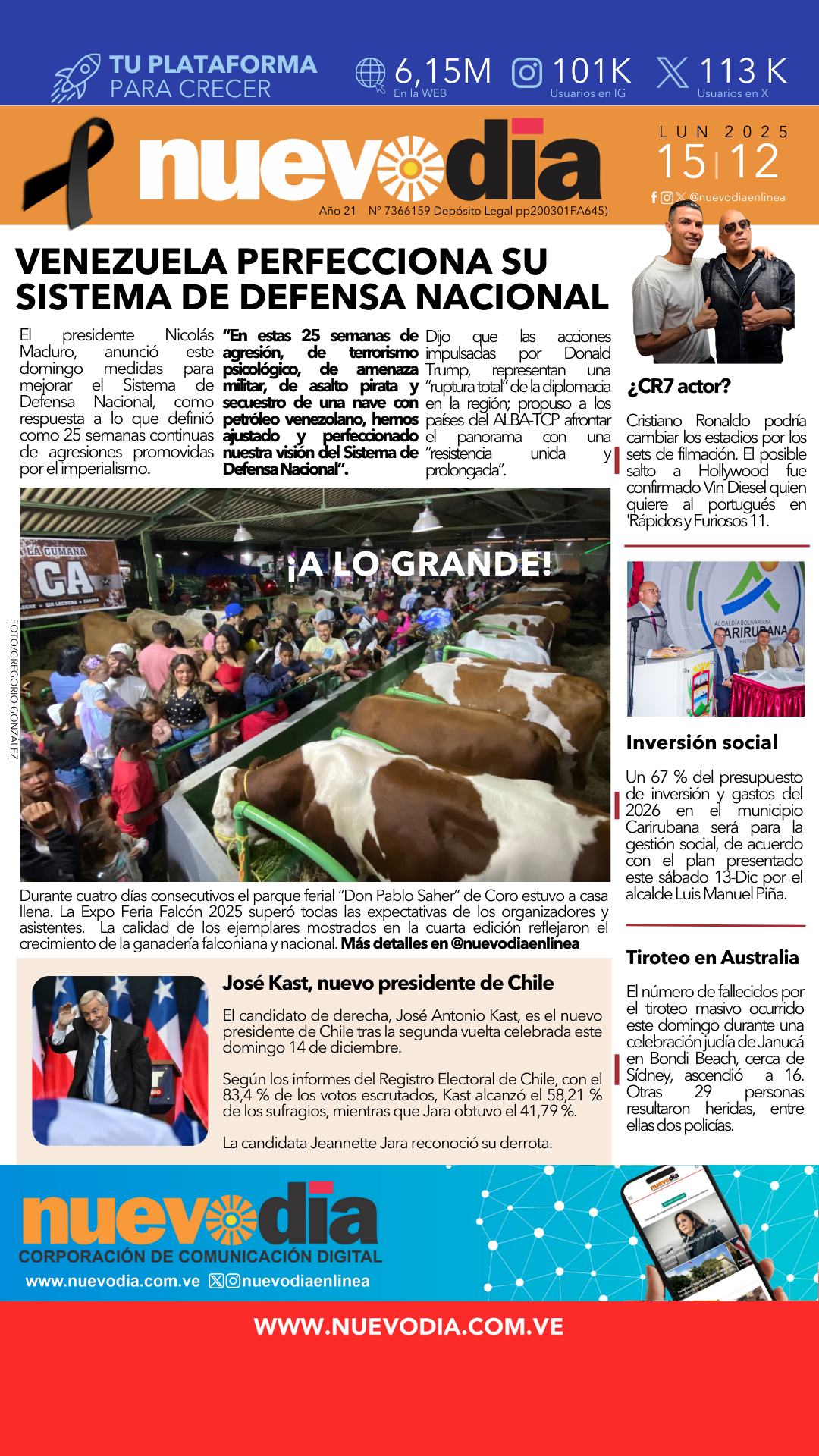 InicioPortadas Portadas Portada lunes 15 de diciembre de 2025 15/12/2025 FacebookTwitterPinterestWhatsApp Cuota FacebookTwitterPinterestWhatsApp Artículo anteriorJosé Antonio Kast es el presidente electo de Chile Yaneth Chacon Noticias Relacionadas Portadas Portada del 12 de diciembre de 2025 Portadas Portada jueves 11 de diciembre de 2025 Portadas Portada del 10 de diciembre de 2025 Redes Sociales20,299FansMe gusta112,425SeguidoresSeguir4,600SuscriptoresSuscribirte Últimas noticias Destacadas EE.UU. suspende vuelo de migrantes venezolanos previsto para este 12-Dic Destacadas Violación de la libertad de navegación en el Caribe denuncia Venezuela Cargar más