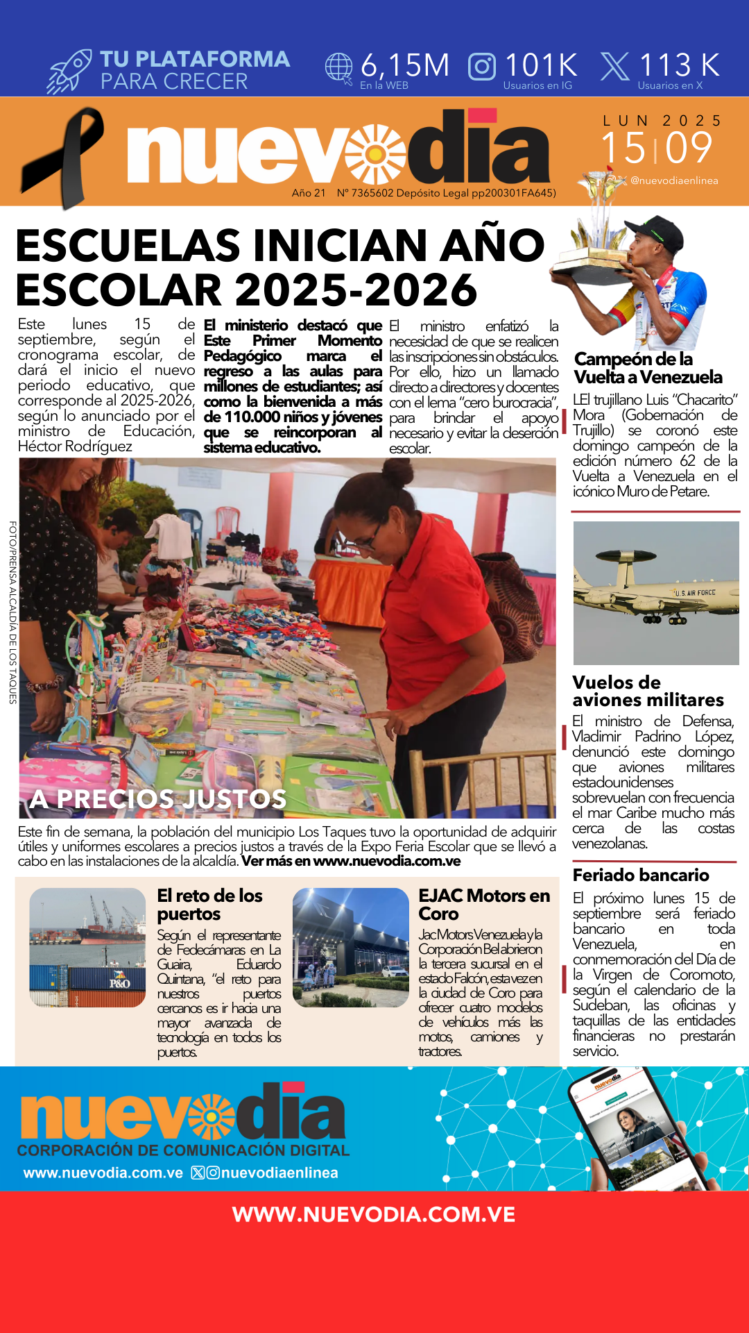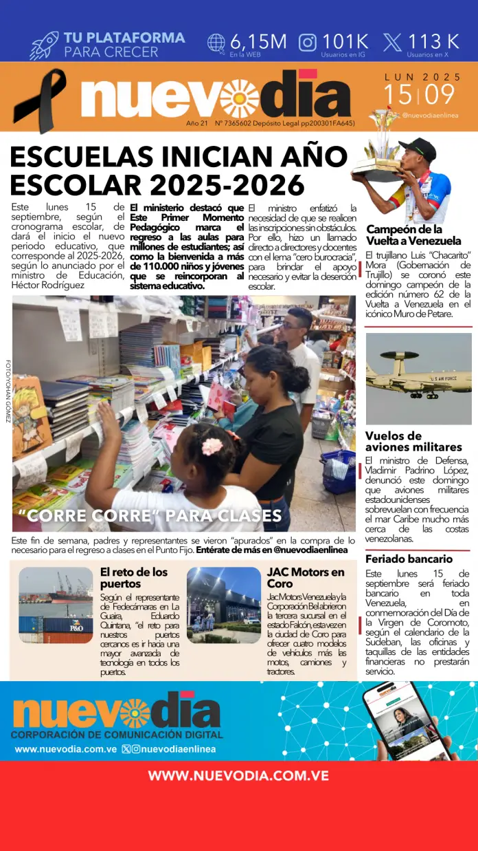 InicioPortadas Portadas Portada lunes 15 de septiembre de 2025 15/09/2025 FacebookTwitterPinterestWhatsApp Cuota FacebookTwitterPinterestWhatsApp Artículo anteriorVenezuela denuncia vuelos de aviones militares de EE.UU.Artículo siguienteInicia la semana y así amaneció el precio del dólar hoy 15-Sep Laura ArismendiEl periodismo...mi forma de vida. Noticias Relacionadas Portadas Portada viernes 3 de octubre de 2025 Portadas Portada jueves 02 de octubre de 2025 Portadas Portada del 01 de octubre de 2025 Redes Sociales20,299FansMe gusta112,425SeguidoresSeguir4,600SuscriptoresSuscribirte Últimas noticias Destacadas FANB| Fortalecen sistema de comando y control para la defensa de Venezuela Destacadas Presidente Maduro: defensa de la soberanía es prioridad nacional Cargar más