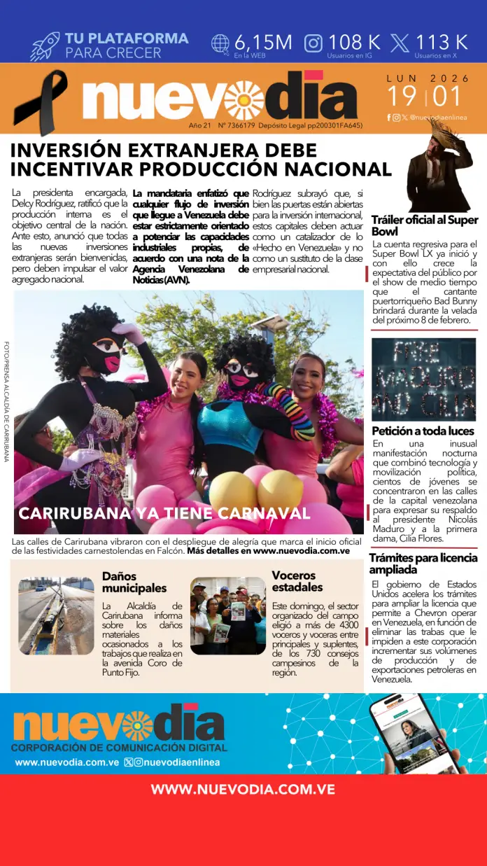 InicioPortadas Portadas Portada lunes 19 de enero de 2026 19/01/2026 FacebookTwitterPinterestWhatsApp Cuota FacebookTwitterPinterestWhatsApp Artículo anteriorSector campesino de Falcón eligió a más de cuatro mil voceros estadales Laura ArismendiEl periodismo...mi forma de vida. Noticias Relacionadas Portadas Portada viernes 16 de enero de 2026 Portadas Portada del jueves 15 de enero de 2026 Portadas Portada miércoles 14 de enero de 2026 Redes Sociales20,299FansMe gusta112,425SeguidoresSeguir4,600SuscriptoresSuscribirte Últimas noticias Destacadas Delcy Rodríguez realiza cambios en el gabinete ministerial Destacadas EE. UU. envía a Venezuela el primer vuelo de deportados desde los ataques del 3-Ene Cargar más