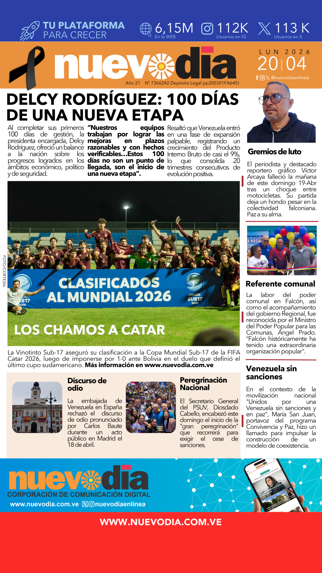 InicioPortadas Portadas Portada lunes 20 de abril de 2026 20/04/2026 FacebookTwitterPinterestWhatsApp Cuota FacebookTwitterPinterestWhatsApp Artículo anteriorAtaque en grabación de “Sin senos sí hay paraíso” deja tres muertosArtículo siguienteTasa oficial | Este es el precio del dólar hoy 20-Abr Yaneth Chacon Noticias Relacionadas Portadas Primera 17 de abril de 2026 Portadas Portada jueves 16 de abril de 2026 Portadas Primera 15 de abril de 2026 Redes Sociales20,299FansMe gusta112,425SeguidoresSeguir4,600SuscriptoresSuscribirte Últimas noticias Destacadas Tasa oficial | Este es el precio del dólar hoy 20-Abr Destacadas Conoce lo que dijo Delcy Rodríguez por sus 100 días de gestión +VIDEO Cargar más