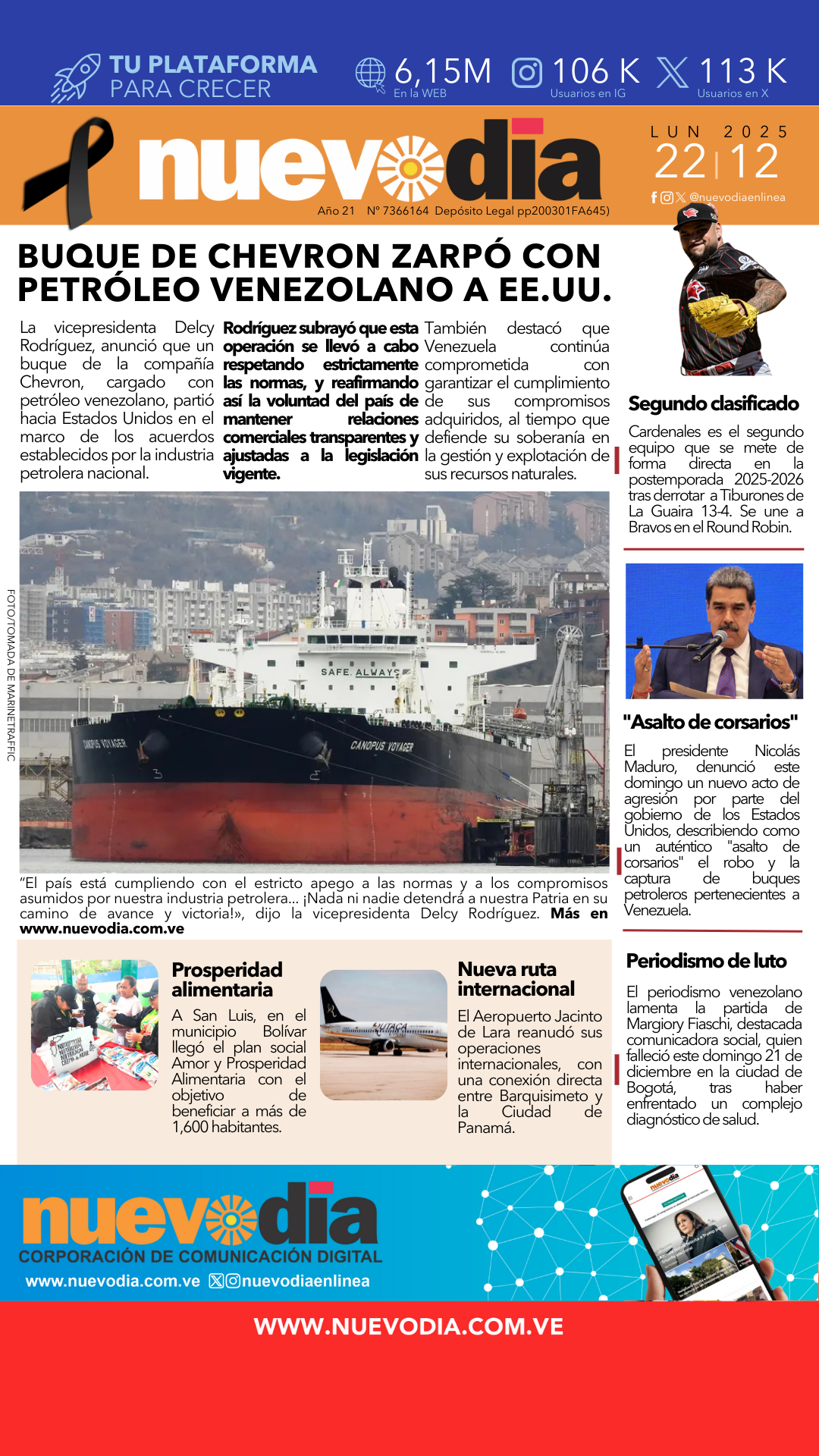 InicioPortadas Portadas Portada lunes 22 de diciembre de 2025 22/12/2025 FacebookTwitterPinterestWhatsApp Cuota FacebookTwitterPinterestWhatsApp Artículo anteriorCampeón del Mundial de Fútbol 2026 se quedará con $50 millones Yaneth Chacon Noticias Relacionadas Portadas Portada viernes 19 de diciembre de 2025 Portadas Portada jueves 18 de diciembre de 2025 Portadas Portada miércoles 17 de diciembre de 2025 Redes Sociales20,299FansMe gusta112,425SeguidoresSeguir4,600SuscriptoresSuscribirte Últimas noticias Destacadas Venezuela registró una disminución de los homicidios en comparación con el 2024 Destacadas Delcy Rodríguez: «Nosotros no le debemos nada a Estados Unidos» Cargar más