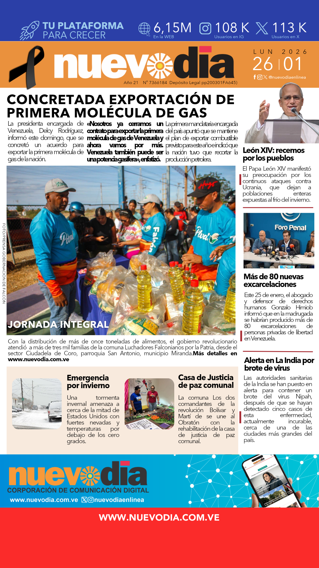 InicioPortadas Portadas Portada lunes 26 de enero de 2026 26/01/2026 FacebookTwitterPinterestWhatsApp Cuota FacebookTwitterPinterestWhatsApp Artículo anteriorMagallanes se mete en la final con otra remontada Laura ArismendiEl periodismo...mi forma de vida. Noticias Relacionadas Portadas Portada viernes 23 de enero de 2026 Portadas Portada jueves 22 de enero de 2026 Portadas Portada miércoles 21 de enero de 2026 Redes Sociales20,299FansMe gusta112,425SeguidoresSeguir4,600SuscriptoresSuscribirte Últimas noticias Destacadas Zarpa desde Venezuela el primer cargamento de crudo Destacadas Delcy Rodríguez: Venezuela resolverá sus conflictos sin «órdenes de Washington» Cargar más