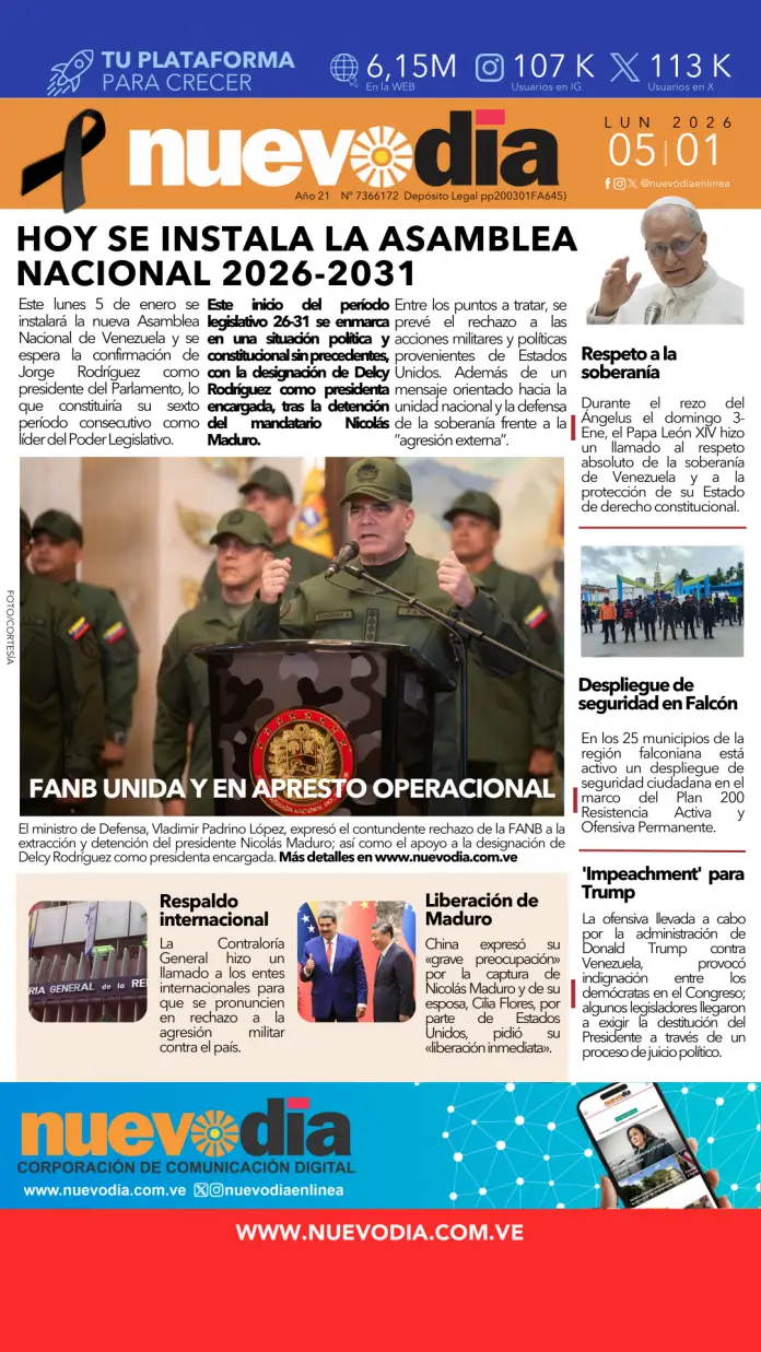 InicioPortadas Portadas Portada lunes 5 de enero de 2026 05/01/2026 FacebookTwitterPinterestWhatsApp Cuota FacebookTwitterPinterestWhatsApp Artículo anteriorInstalación de la nueva Asamblea Nacional será este lunes 5-EneArtículo siguienteEdicto.Antonio José Chirino Lugo y Jorge Federico Chirinos Lugo. Yaneth Chacon Noticias Relacionadas Portadas Portada jueves 1 de enero de 2026 Portadas Portada miércoles 31 de diciembre de 2025 Portadas Portada martes 30 de diciembre de 2025 Redes Sociales20,299FansMe gusta112,425SeguidoresSeguir4,600SuscriptoresSuscribirte Últimas noticias Destacadas Jorge Rodríguez: «Nos comprometemos a corregir el rumbo de lo que sea necesario» Destacadas Juramentada Delcy Rodríguez como presidenta encargada de Venezuela Cargar más
