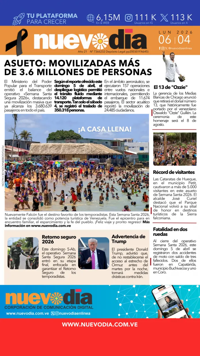 InicioPortadas Portadas Portada lunes 6 de abril de 2026 06/04/2026 FacebookTwitterPinterestWhatsApp Cuota FacebookTwitterPinterestWhatsApp Artículo anteriorTres motorizados fallecidos este 5-Abr en Falcón +FOTOS Yaneth Chacon Noticias Relacionadas Portadas Portada viernes 3 de abril de 2026 Portadas Primera del 2 de abril de 2026 Portadas Portada miércoles 1 de abril de 2026 Redes Sociales20,299FansMe gusta112,425SeguidoresSeguir4,600SuscriptoresSuscribirte Últimas noticias Destacadas Movilización en Semana Santa 2026 superó los 3,6 millones de personas Destacadas Aeropuerto de Maiquetía registra alta movilización en Semana Santa Cargar más