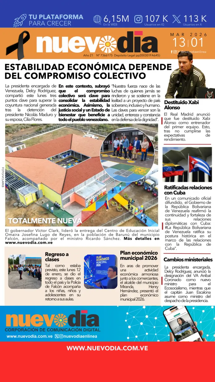 InicioPortadas Portadas Portada martes 13 de enero de 2026 13/01/2026 FacebookTwitterPinterestWhatsApp Cuota FacebookTwitterPinterestWhatsApp Artículo anteriorDelcy Rodríguez responde ante meme de Trump como «presidente interino de Venezuela» Laura ArismendiEl periodismo...mi forma de vida. Noticias Relacionadas Portadas Portada lunes 12 de enero de 2026 Portadas Portada martes 6 de enero de 2026 Portadas Portada lunes 5 de enero de 2026 Redes Sociales20,299FansMe gusta112,425SeguidoresSeguir4,600SuscriptoresSuscribirte Últimas noticias Destacadas Delcy Rodríguez responde ante meme de Trump como «presidente interino de Venezuela» Destacadas Precio del pasaje urbano en Venezuela: Nuevas tarifas en Gaceta Cargar más