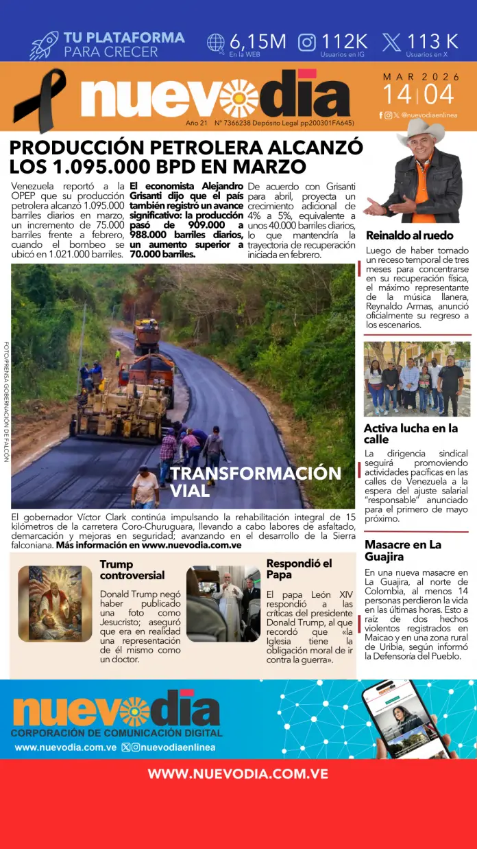 InicioPortadas Portadas Portada martes 14 de abril de 2026 14/04/2026 FacebookTwitterPinterestWhatsApp Cuota FacebookTwitterPinterestWhatsApp Artículo anteriorVladimir Padrino López es designado como nuevo ministro para la Agricultura Yaneth Chacon Noticias Relacionadas Portadas Primera del 13 de abril de 2026 Portadas Portada del viernes 10 de abril de 2026 Portadas Primera del 09 de abril de 2026 Redes Sociales20,299FansMe gusta112,425SeguidoresSeguir4,600SuscriptoresSuscribirte Últimas noticias Destacadas Vladimir Padrino López es designado como nuevo ministro para la Agricultura Destacadas Diosdado Cabello descarta adelanto de elecciones presidenciales Cargar más