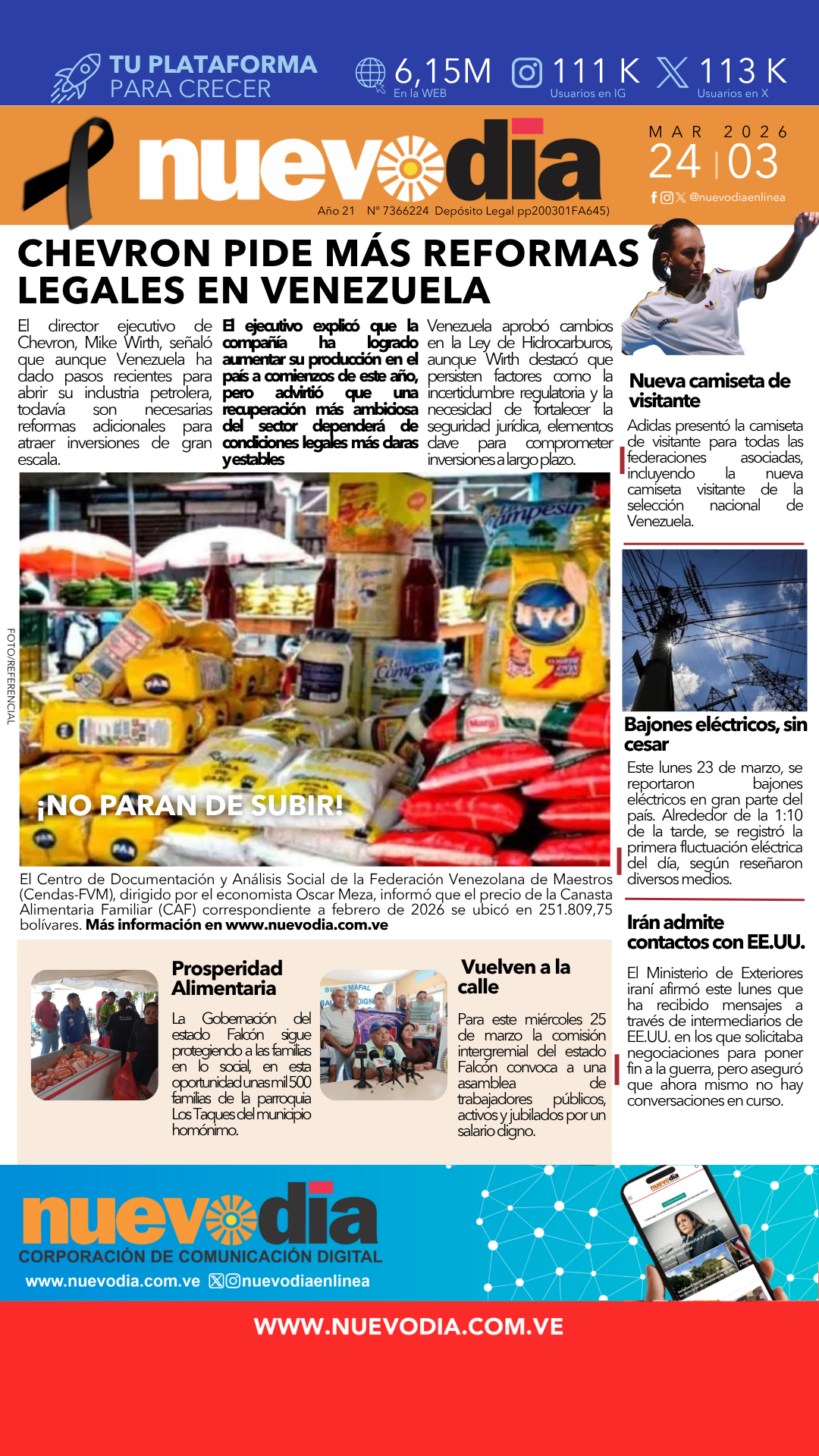 InicioPortadas Portadas Portada martes 24 de marzo de 2026 24/03/2026 FacebookTwitterPinterestWhatsApp Cuota FacebookTwitterPinterestWhatsApp Artículo anteriorNetflix lanza el tráiler de la tercera temporada de «Merlina» Laura ArismendiEl periodismo...mi forma de vida. Noticias Relacionadas Portadas Portada lunes 23 de marzo de 2026 Portadas Primera del 20 de marzo de 2026 Portadas Portada jueves 19 de marzo de 2026 Redes Sociales20,299FansMe gusta112,425SeguidoresSeguir4,600SuscriptoresSuscribirte Últimas noticias Destacadas Chevron pide más reformas legales para ampliar inversiones en Venezuela Destacadas Venezuela se solidariza con Colombia tras accidente aéreo (COMUNICADO) Cargar más