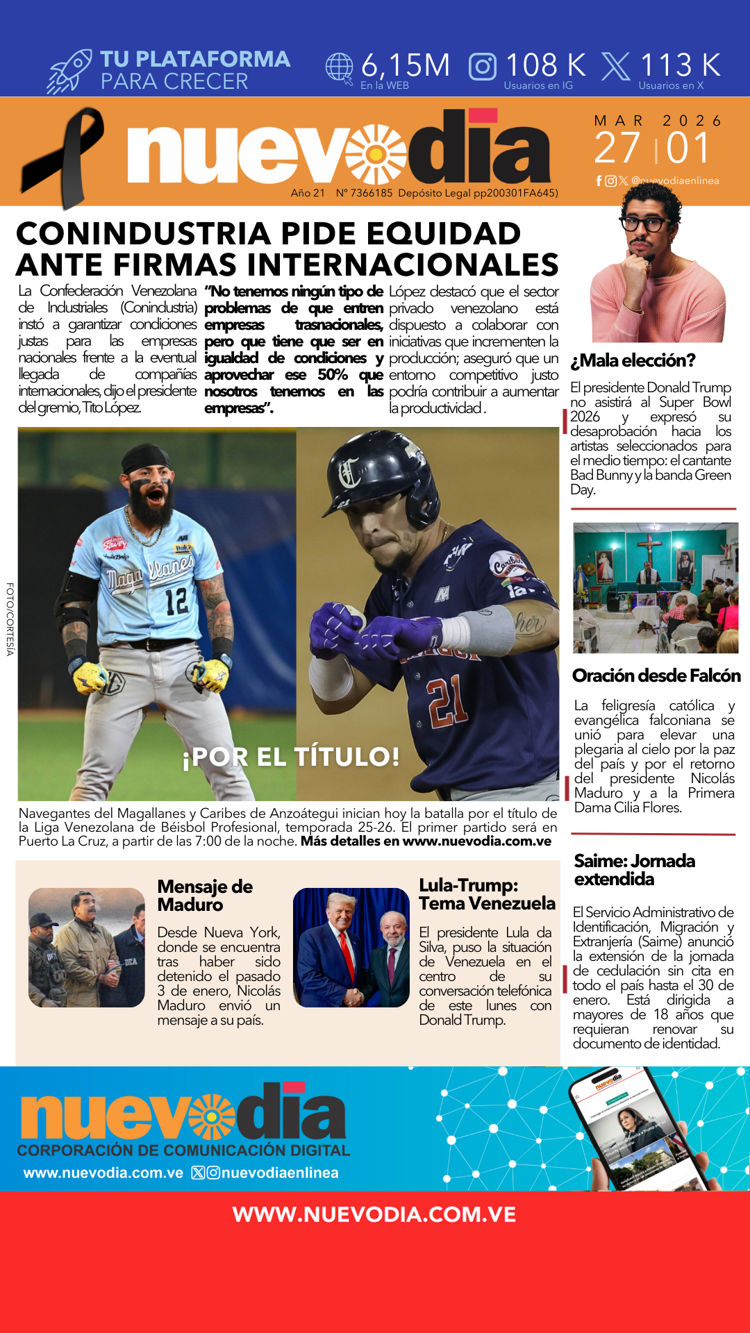 InicioPortadas Portadas Portada martes 27 de enero de 2026 27/01/2026 FacebookTwitterPinterestWhatsApp Cuota FacebookTwitterPinterestWhatsApp Artículo anterior¿Cuál es el peligro y los síntomas del virus Nipah? Esto se sabe Yaneth Chacon Noticias Relacionadas Portadas Portada lunes 26 de enero de 2026 Portadas Portada viernes 23 de enero de 2026 Portadas Portada jueves 22 de enero de 2026 Redes Sociales20,299FansMe gusta112,425SeguidoresSeguir4,600SuscriptoresSuscribirte Últimas noticias Destacadas Venezuela estará afectada por el calor extremo en 2050 Destacadas Conindustria pide equidad frente a posible llegada de firmas internacionales Cargar más