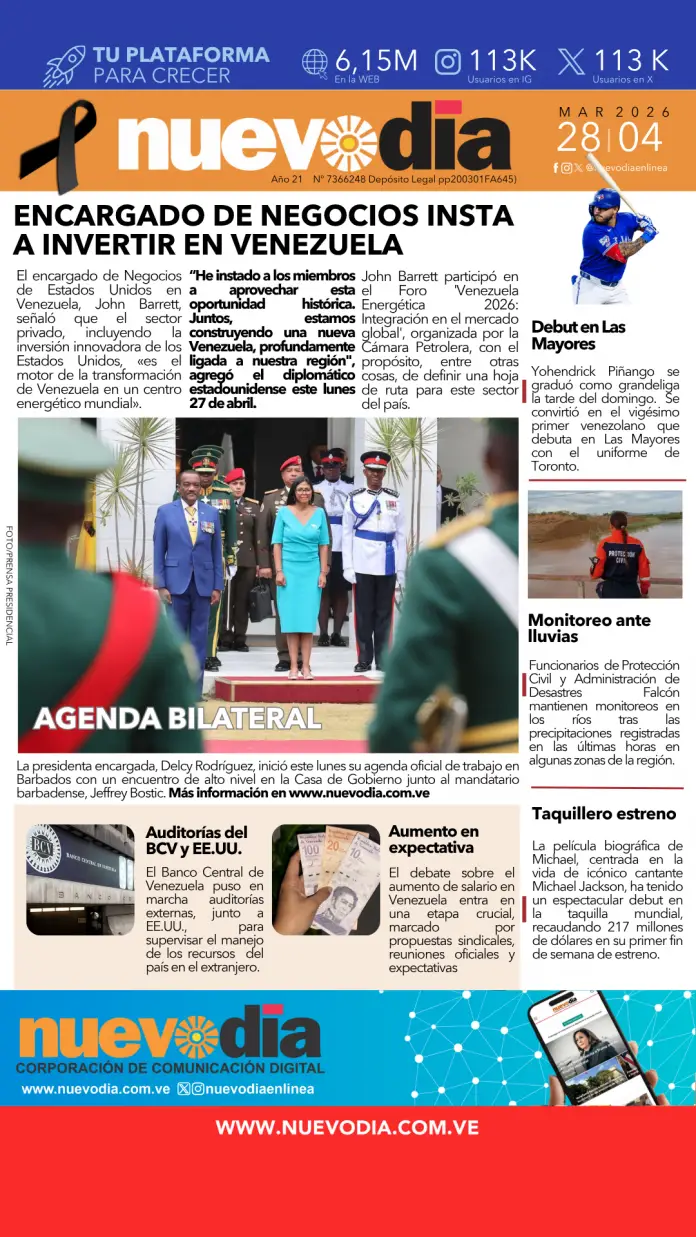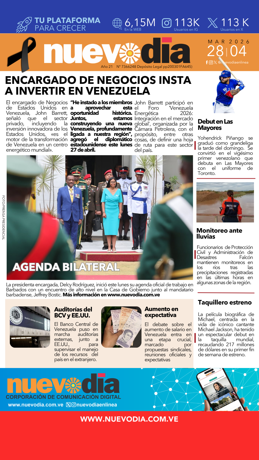 InicioPortadas Portadas Portada martes 28 de abril de 2026 28/04/2026 FacebookTwitterPinterestWhatsApp Cuota FacebookTwitterPinterestWhatsApp Artículo anterior¿El enjuague bucal realmente daña el corazón? Esto dicen los estudios Yaneth Chacon Noticias Relacionadas Portadas Primera del 27 de abril de 2026 Portadas Portada viernes 24 de abril de 2026 Portadas Primera 23 de abril de 2026 Redes Sociales20,299FansMe gusta112,425SeguidoresSeguir4,600SuscriptoresSuscribirte Últimas noticias Destacadas BCV proyecta periodo de estabilidad cambiaria y descenso inflacionario Destacadas Delcy Rodríguez inicia agenda oficial en Barbados con encuentro de alto nivel Cargar más