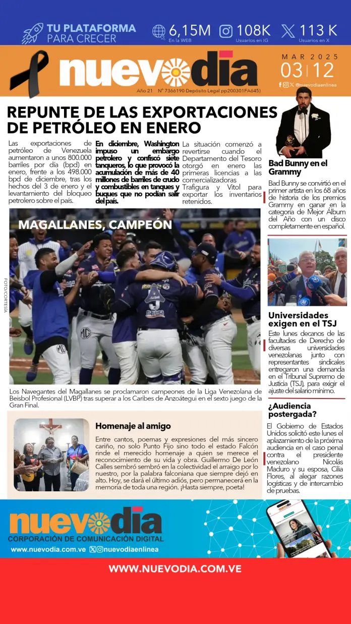 InicioPortadas Portadas Portada martes 3 de febrero de 2026 03/02/2026 FacebookTwitterPinterestWhatsApp Cuota FacebookTwitterPinterestWhatsApp Artículo anteriorMagallanes campeón de la LVBP 25-26, así lo celebraron +VIDEO Laura ArismendiEl periodismo...mi forma de vida. Noticias Relacionadas Portadas Portada lunes 02 de febrero de 2026 Portadas Portada viernes 29 de enero de 2026 Portadas Portada jueves 29 de enero de 2026 Redes Sociales20,299FansMe gusta112,425SeguidoresSeguir4,600SuscriptoresSuscribirte Últimas noticias Destacadas Delcy Rodríguez recibió en Miraflores a la encargada de negocios de EE. UU. en Venezuela Destacadas Universidades exigen ante el TSJ aumento de salarios Cargar más