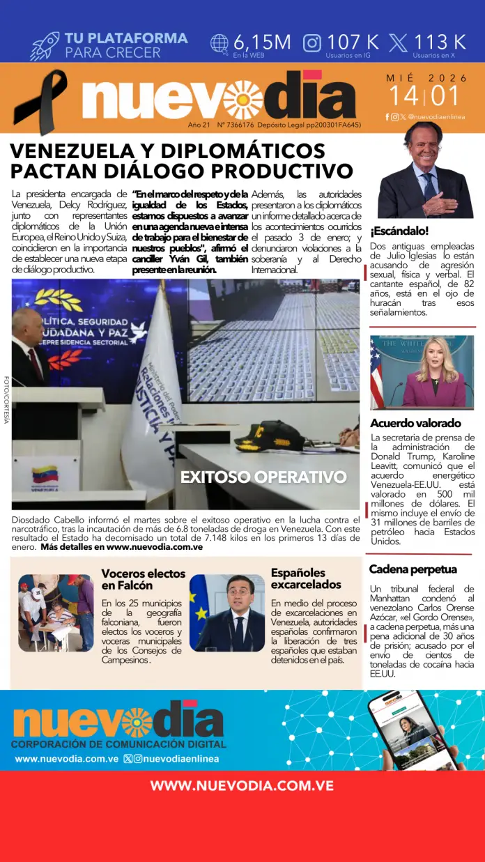 InicioPortadas Portadas Portada miércoles 14 de enero de 2026 14/01/2026 FacebookTwitterPinterestWhatsApp Cuota FacebookTwitterPinterestWhatsApp Artículo anteriorTramita la cédula en el Saime sin cita este sábado Yaneth Chacon Noticias Relacionadas Portadas Portada martes 13 de enero de 2026 Portadas Portada lunes 12 de enero de 2026 Portadas Portada martes 6 de enero de 2026 Redes Sociales20,299FansMe gusta112,425SeguidoresSeguir4,600SuscriptoresSuscribirte Últimas noticias Nacionales Tramita la cédula en el Saime sin cita este sábado Destacadas Incautan más de 6.8 toneladas de droga en Venezuela +VIDEO Cargar más