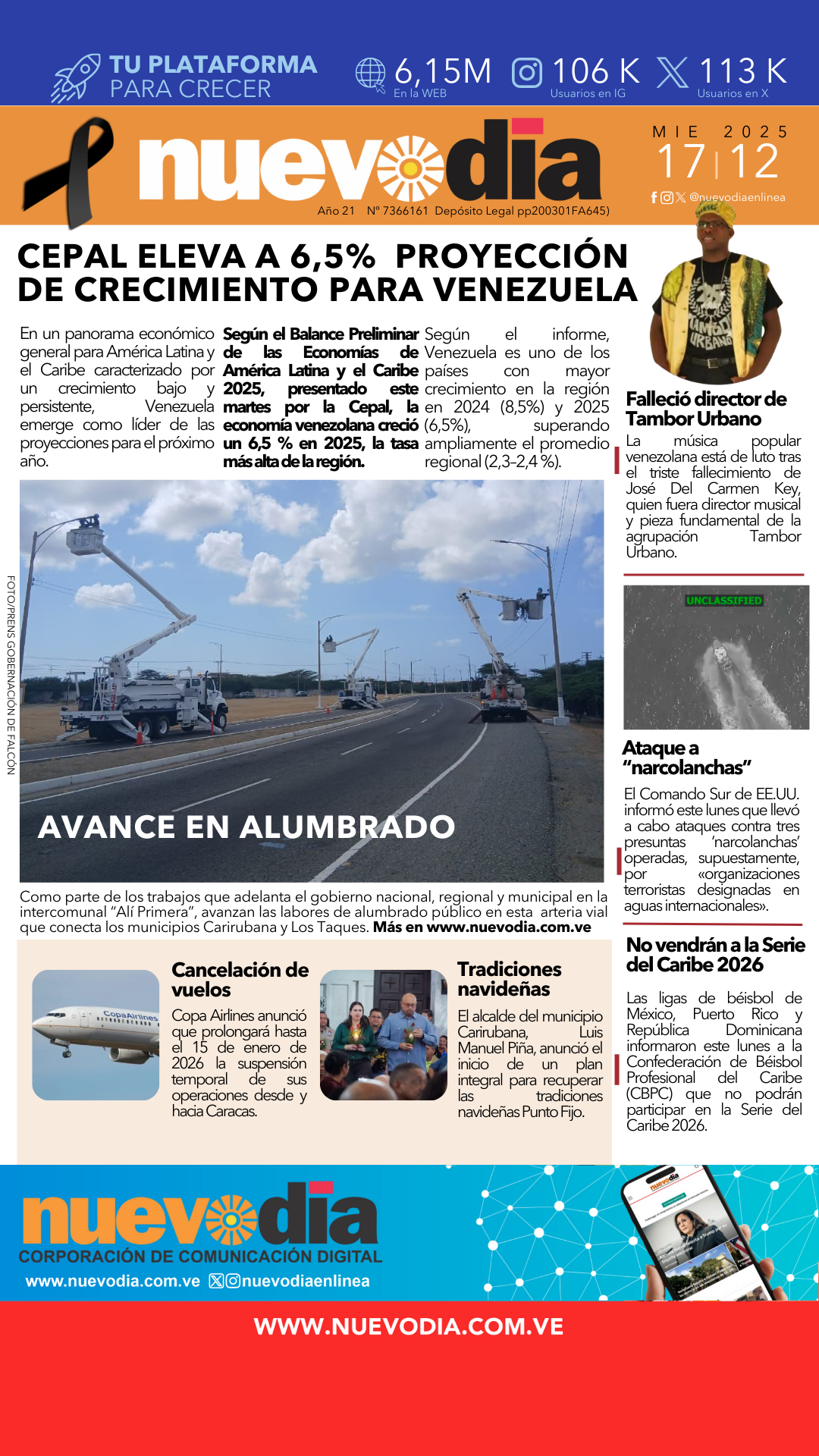 InicioPortadas Portadas Portada miércoles 17 de diciembre de 2025 17/12/2025 FacebookTwitterPinterestWhatsApp Cuota FacebookTwitterPinterestWhatsApp Artículo anteriorGran Misión Vuelta a la Patria ha recibido un millón 100 mil venezolanos Laura ArismendiEl periodismo...mi forma de vida. Noticias Relacionadas Portadas Portada del 16 de diciembre de 2025 Portadas Portada lunes 15 de diciembre de 2025 Portadas Portada del 12 de diciembre de 2025 Redes Sociales20,299FansMe gusta112,425SeguidoresSeguir4,600SuscriptoresSuscribirte Últimas noticias Destacadas Gran Misión Vuelta a la Patria ha recibido un millón 100 mil venezolanos Destacadas Copa Airlines extiende cancelación de vuelos a Caracas hasta el 15-Ene Cargar más