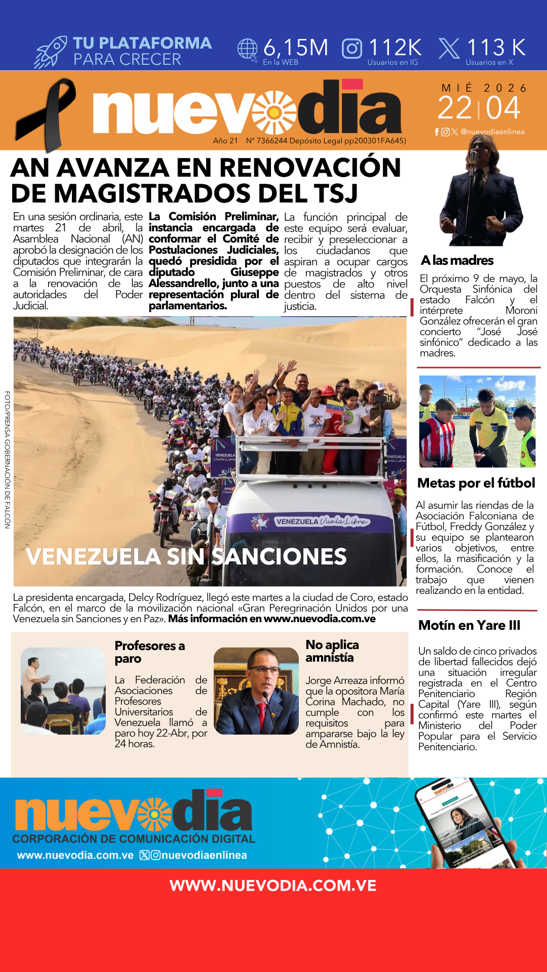 InicioPortadas Portadas Portada miércoles 22 de abril de 2026 22/04/2026 FacebookTwitterPinterestWhatsApp Cuota FacebookTwitterPinterestWhatsApp Artículo anteriorMinistro Alcalá continúa despliegue por instalaciones eléctricas en Falcón Yaneth Chacon Noticias Relacionadas Portadas Primera del 21 de abril de 2026 Portadas Portada lunes 20 de abril de 2026 Portadas Primera 17 de abril de 2026 Redes Sociales20,299FansMe gusta112,425SeguidoresSeguir4,600SuscriptoresSuscribirte Últimas noticias Destacadas AN nombra comisión preliminar para postulaciones judiciales Destacadas AN prepara selección del comité encargado de evaluar aspirantes a magistrados del TSJ Cargar más