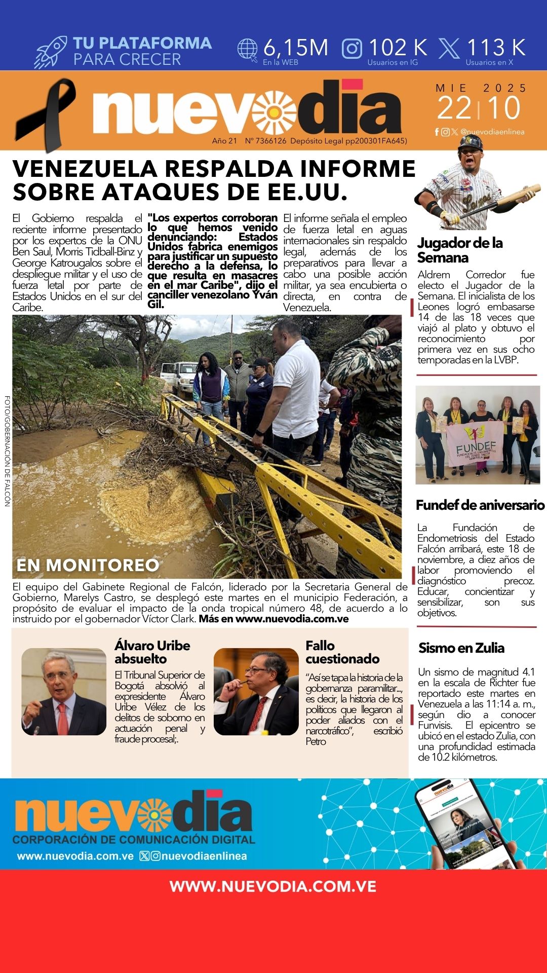 InicioPortadas Portadas Portada miércoles 22 de octubre de 2025 22/10/2025 FacebookTwitterPinterestWhatsApp Cuota FacebookTwitterPinterestWhatsApp Artículo anteriorGobierno bolivariano atiende contingencia de lluvias en municipio Federación Yaneth Chacon Noticias Relacionadas Portadas Portada del 21 de octubre de 2025 Portadas Primera lunes 20 de octubre de 2025 Portadas Portada viernes 17 de octubre de 2025 Redes Sociales20,299FansMe gusta112,425SeguidoresSeguir4,600SuscriptoresSuscribirte Últimas noticias Destacadas Venezuela: informe de expertos de la ONU advierten acción de EE.UU. Destacadas Atienden colapso de viviendas y daños ocasionados por lluvias en Caracas Cargar más
