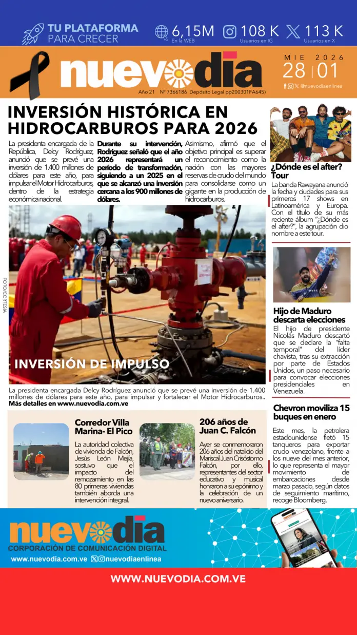 InicioPortadas Portadas Portada miércoles 28 de enero de 2026 28/01/2026 FacebookTwitterPinterestWhatsApp Cuota FacebookTwitterPinterestWhatsApp Artículo anteriorDelsa Solórzano reaparece en Caracas y esto dijo: VIDEO Laura ArismendiEl periodismo...mi forma de vida. Noticias Relacionadas Portadas Portada martes 27 de enero de 2026 Portadas Portada lunes 26 de enero de 2026 Portadas Portada viernes 23 de enero de 2026 Redes Sociales20,299FansMe gusta112,425SeguidoresSeguir4,600SuscriptoresSuscribirte Últimas noticias Destacadas Delsa Solórzano reaparece en Caracas y esto dijo: VIDEO Destacadas Invertirán $ 1.400 millones para fortalecer el Motor Hidrocarburos en 2026 Cargar más