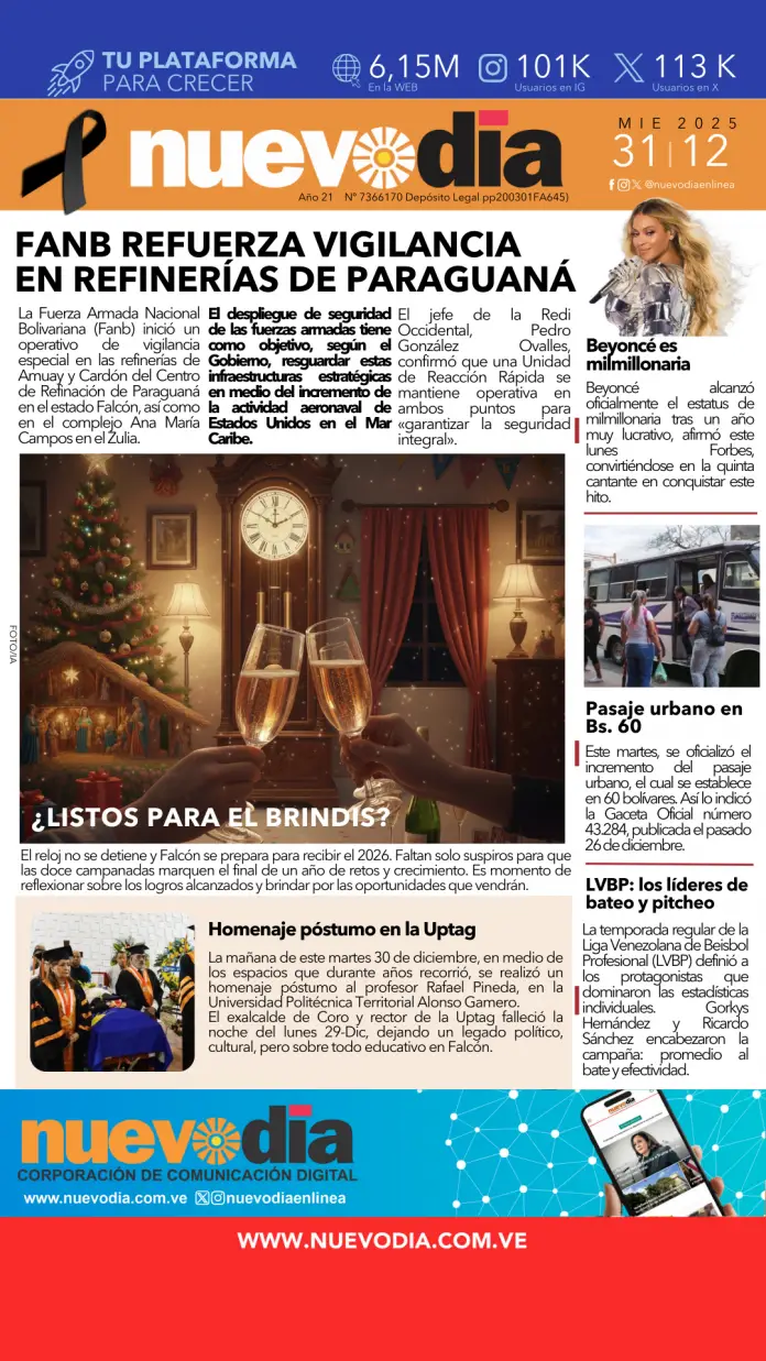 InicioPortadas Portadas Portada miércoles 31 de diciembre de 2025 31/12/2025 FacebookTwitterPinterestWhatsApp Cuota FacebookTwitterPinterestWhatsApp Artículo anteriorLa Fanb refuerza vigilancia en el CRP y complejo Ana María Campos Laura ArismendiEl periodismo...mi forma de vida. Noticias Relacionadas Portadas Portada martes 30 de diciembre de 2025 Portadas Primera lunes 29 de diciembre de 2025 Portadas Portada jueves 25 de diciembre de 2025 Redes Sociales20,299FansMe gusta112,425SeguidoresSeguir4,600SuscriptoresSuscribirte Últimas noticias Destacadas La Fanb refuerza vigilancia en el CRP y complejo Ana María Campos Destacadas Venezuela proyecta incremento del turismo receptivo para 2026 Cargar más