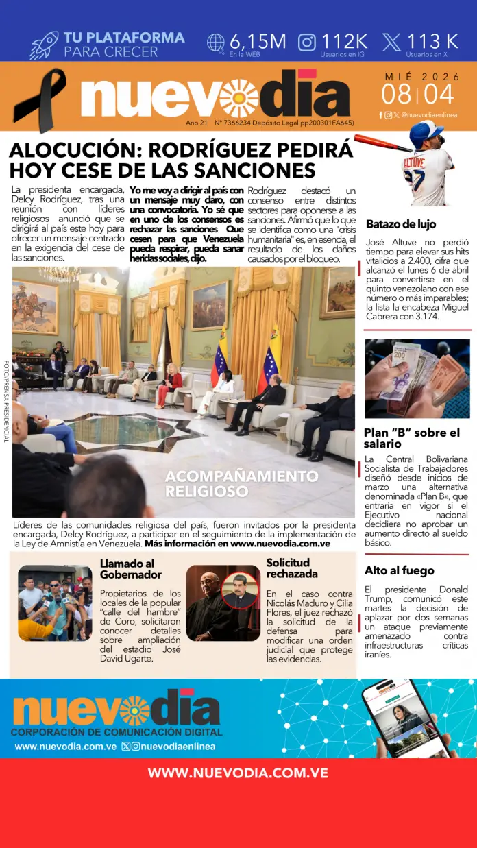 InicioPortadas Portadas Portada miércoles 8 de abril de 2026 08/04/2026 FacebookTwitterPinterestWhatsApp Cuota FacebookTwitterPinterestWhatsApp Artículo anteriorJoven desaparecida en Buchivacoa se presentó ante el CICPC Dabajuro Yaneth Chacon Noticias Relacionadas Portadas Portada 07 de abril de 2026 Portadas Portada lunes 6 de abril de 2026 Portadas Portada viernes 3 de abril de 2026 Redes Sociales20,299FansMe gusta112,425SeguidoresSeguir4,600SuscriptoresSuscribirte Últimas noticias Destacadas Delcy Rodríguez ofrecerá mensaje al país este miércoles para realizar una «convocatoria» Destacadas Hinterlaces | 81% de los venezolanos apuestan gestión económica de Rodríguez Cargar más