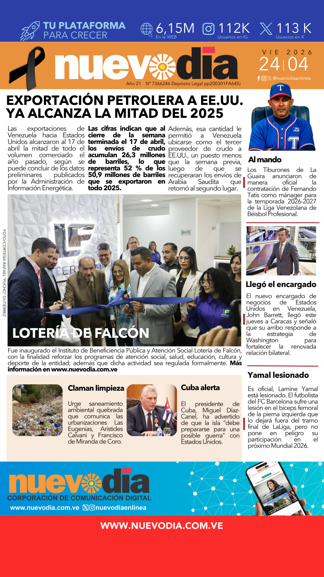 InicioPortadas Portadas Portada viernes 24 de abril de 2026 24/04/2026 FacebookTwitterPinterestWhatsApp Cuota FacebookTwitterPinterestWhatsApp Artículo anterior¿En qué se benefician los bebedores del café descafeinado y de café con cafeína? Yaneth Chacon Noticias Relacionadas Portadas Primera 23 de abril de 2026 Portadas Portada miércoles 22 de abril de 2026 Portadas Primera del 21 de abril de 2026 Redes Sociales20,299FansMe gusta112,425SeguidoresSeguir4,600SuscriptoresSuscribirte Últimas noticias Destacadas Instalan comisión de consulta nacional para la reforma de la justicia penal Destacadas Cabello confirma nuevas destituciones y detenciones de funcionarios corruptos Cargar más