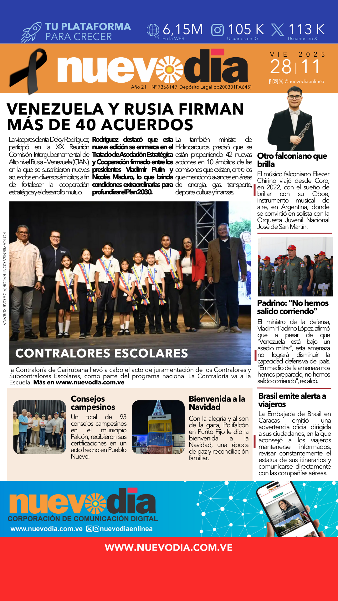 InicioPortadas Portadas Portada viernes 28 de noviembre de 2025 28/11/2025 FacebookTwitterPinterestWhatsApp Cuota FacebookTwitterPinterestWhatsApp Artículo anteriorVenezuela y Rusia suscribieron 42 acuerdos en diversas áreas Laura ArismendiEl periodismo...mi forma de vida. Noticias Relacionadas Portadas Portada 27 de noviembre de 2025 Portadas Portada miércoles 26 de noviembre de 2025 Portadas Portada martes 25 de noviembre de 2025 Redes Sociales20,299FansMe gusta112,425SeguidoresSeguir4,600SuscriptoresSuscribirte Últimas noticias Destacadas Venezuela y Rusia suscribieron 42 acuerdos en diversas áreas Destacadas Maduro: «82% de los venezolanos dicen que están dispuestos a defender su patria sagrada» Cargar más
