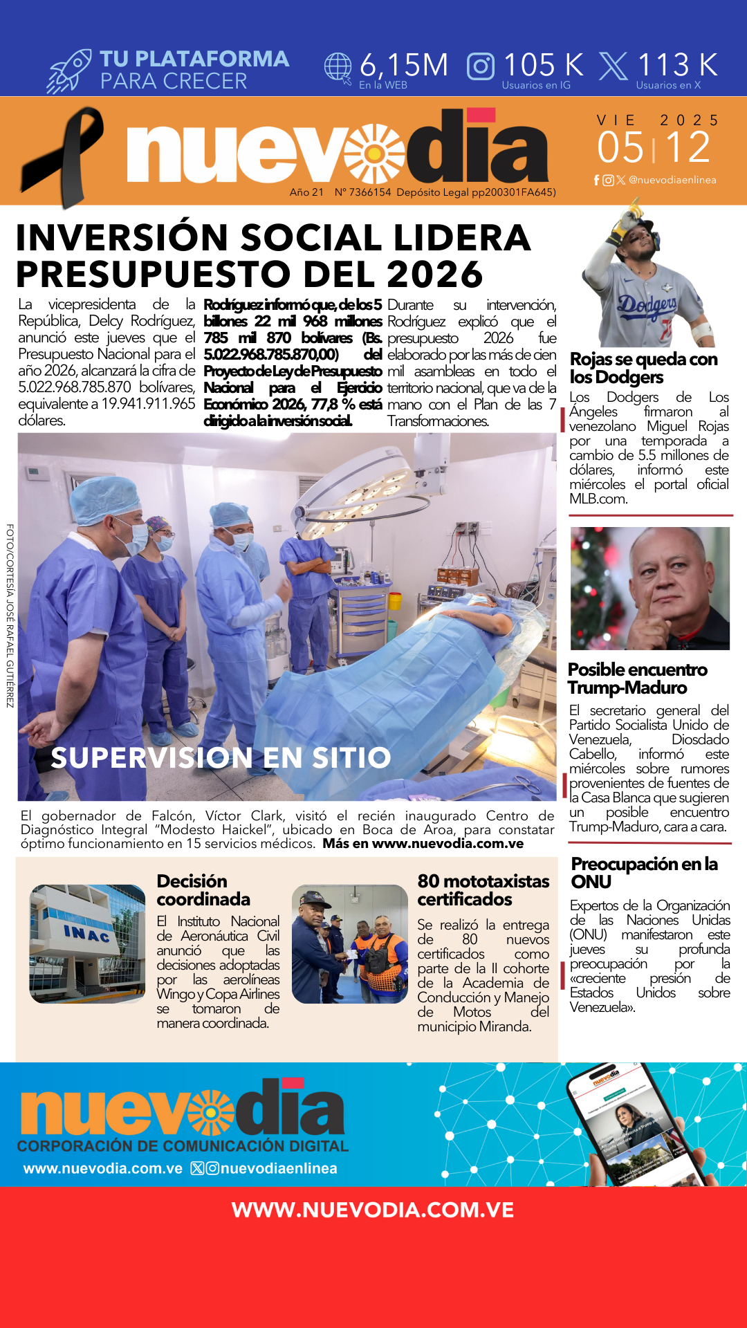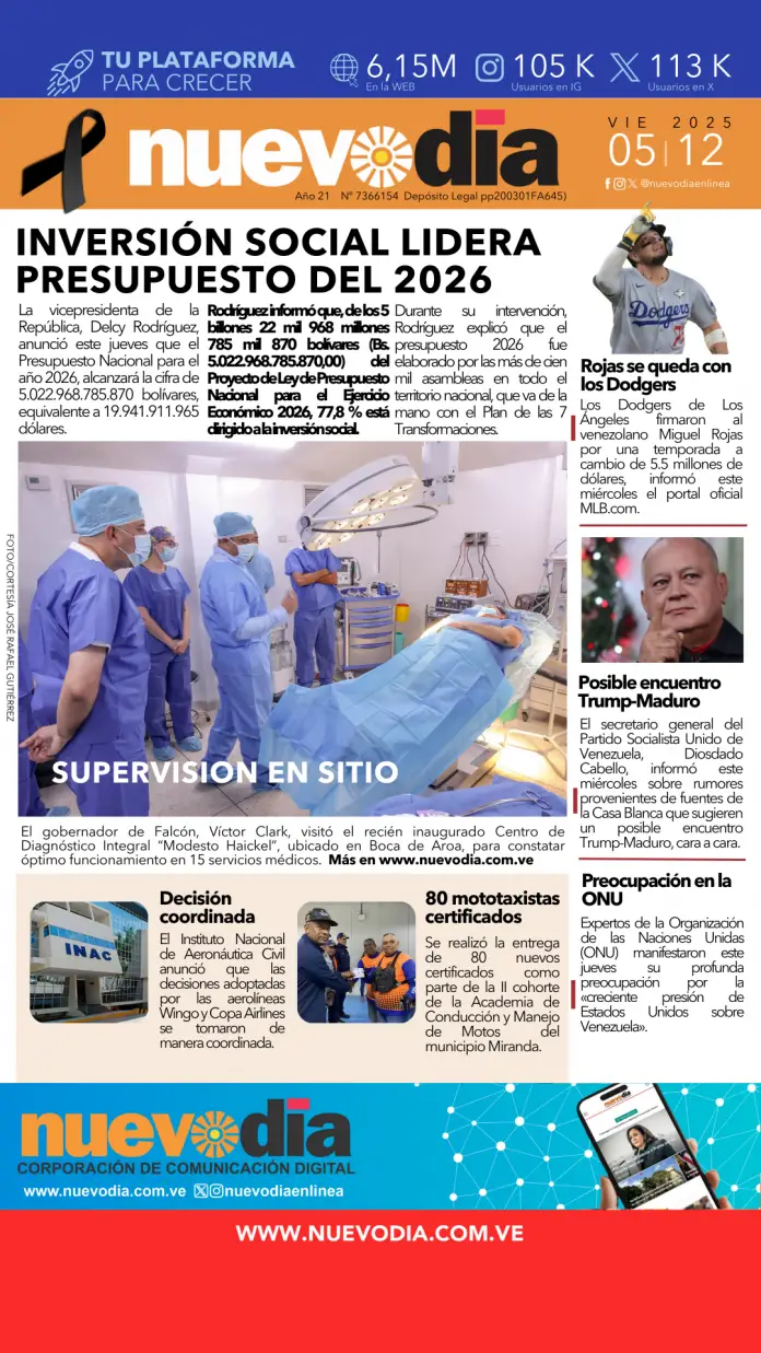InicioPortadas Portadas Portada viernes 5 de diciembre de 2025 05/12/2025 FacebookTwitterPinterestWhatsApp Cuota FacebookTwitterPinterestWhatsApp Artículo anteriorMiss Miranda, Clara Vegas Goetz, es Miss Universe Venezuela 2025 Laura ArismendiEl periodismo...mi forma de vida. Noticias Relacionadas Portadas Portada jueves 4 de diciembre de 2025 Portadas Portada del 3 de diciembre de 2025 Portadas Portada martes 2 de diciembre de 2025 Redes Sociales20,299FansMe gusta112,425SeguidoresSeguir4,600SuscriptoresSuscribirte Últimas noticias Destacadas Inac espera que aerolíneas Wingo y Copa retomen vuelos en 48 horas Destacadas 48 horas | Inac espera que Wingo y Copa reanuden vuelos Cargar más