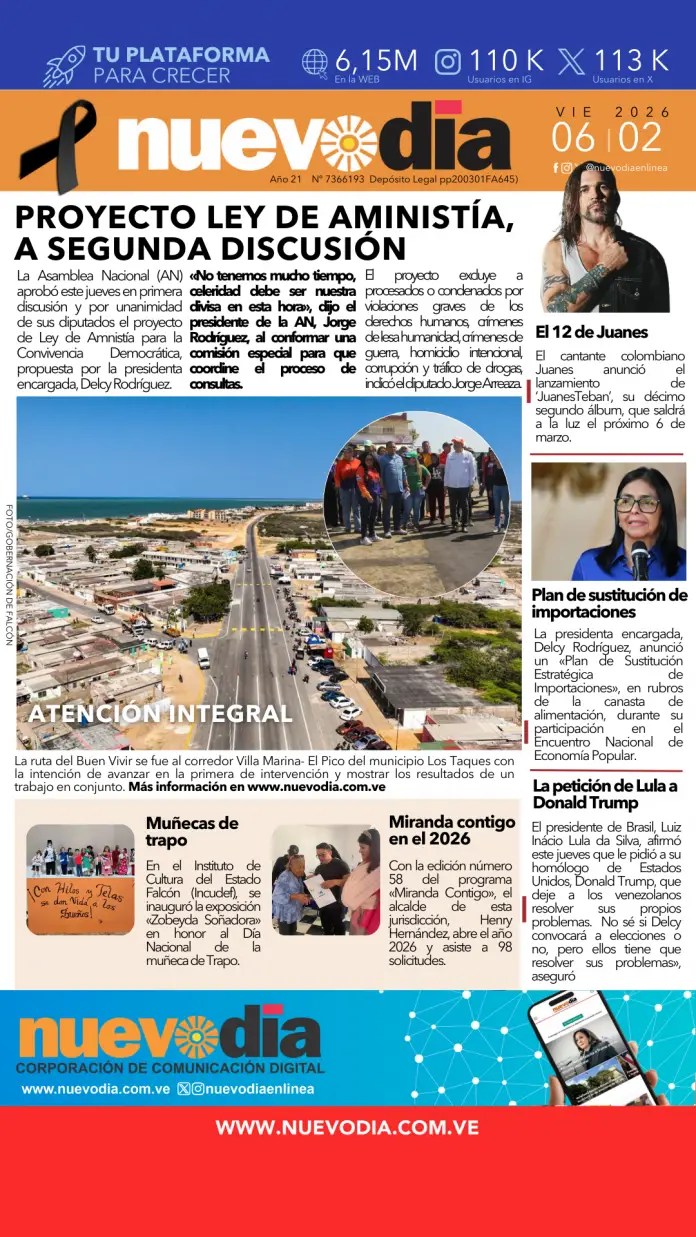 InicioPortadas Portadas Portada viernes 6 de febrero de 2026 06/02/2026 FacebookTwitterPinterestWhatsApp Cuota FacebookTwitterPinterestWhatsApp Artículo anteriorCapturado por el homicidio de su pareja, ella lo iba a dejar Laura ArismendiEl periodismo...mi forma de vida. Noticias Relacionadas Portadas Primera del 05 de febrero de 2026 Portadas Portada miércoles 4 de febrero de 2026 Portadas Portada martes 3 de febrero de 2026 Redes Sociales20,299FansMe gusta112,425SeguidoresSeguir4,600SuscriptoresSuscribirte Últimas noticias Destacadas AN aprueba en primera discusión el proyecto de Ley de Amnistía Destacadas Guanipa: apoyaremos la Ley de Amnistía para que sea «orgullo de todos los venezolanos» Cargar más
