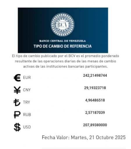 Estos montos podrían variar en horas de la tarde cuando el Banco Central de Venezuela realice la actualización acostumbrada y se fijen las tasas con fecha valor para el miércoles 22 de octubre.