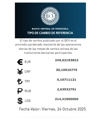 El precio del dólar BCV al 24 de octubre de 2025 publicada por el Banco Central de Venezuela (BCV) se fijó en 214,419 Bs/USD presentando un incremento de Bs. +1,9353 (+0,9108%) con respecto a la jornada anterior.