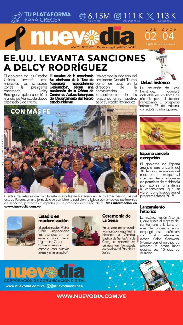 InicioPortadas Portadas Primera del 2 de abril de 2026 02/04/2026 FacebookTwitterPinterestWhatsApp Cuota FacebookTwitterPinterestWhatsApp Artículo anteriorEmbajada de EE.UU. en Caracas envía mensaje de fe en Semana Santa Josmary EscalonaPeriodista principalmente de la fuente política que también hace diarismo, entrevistas y trabajos especiales sobre temas que la población desea conocer. Noticias Relacionadas Portadas Portada miércoles 1 de abril de 2026 Portadas Portada martes 31 de marzo de 2026 Portadas Primera del 30 de marzo de 2026 Redes Sociales20,299FansMe gusta112,425SeguidoresSeguir4,600SuscriptoresSuscribirte Últimas noticias Nacionales Embajada de EE.UU. en Caracas envía mensaje de fe en Semana Santa Destacadas Esto dijo Delcy Rodríguez tras decisión de EE.UU. de levantar sanciones en su contra Cargar más