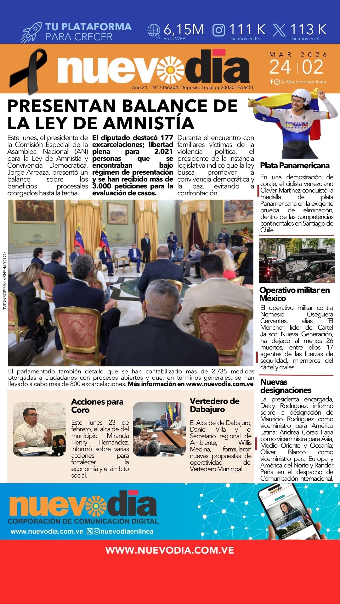 InicioPortadas Portadas Primera del 24 de febrero de 2026 24/02/2026 FacebookTwitterPinterestWhatsApp Cuota FacebookTwitterPinterestWhatsApp Artículo anteriorBernabé Gutiérrez: no habrá elecciones en Venezuela hasta que finalice el actual periodo Josmary EscalonaPeriodista principalmente de la fuente política que también hace diarismo, entrevistas y trabajos especiales sobre temas que la población desea conocer. Noticias Relacionadas Portadas Portada lunes 23 de febrero de 2026 Portadas Primera del 20 de febrero de 2026 Portadas Portada jueves 19 de febrero de 2026 Redes Sociales20,299FansMe gusta112,425SeguidoresSeguir4,600SuscriptoresSuscribirte Últimas noticias Destacadas Bernabé Gutiérrez: no habrá elecciones en Venezuela hasta que finalice el actual periodo Destacadas Venezuela denuncia ante la ONU «agresión multiforme» Cargar más
