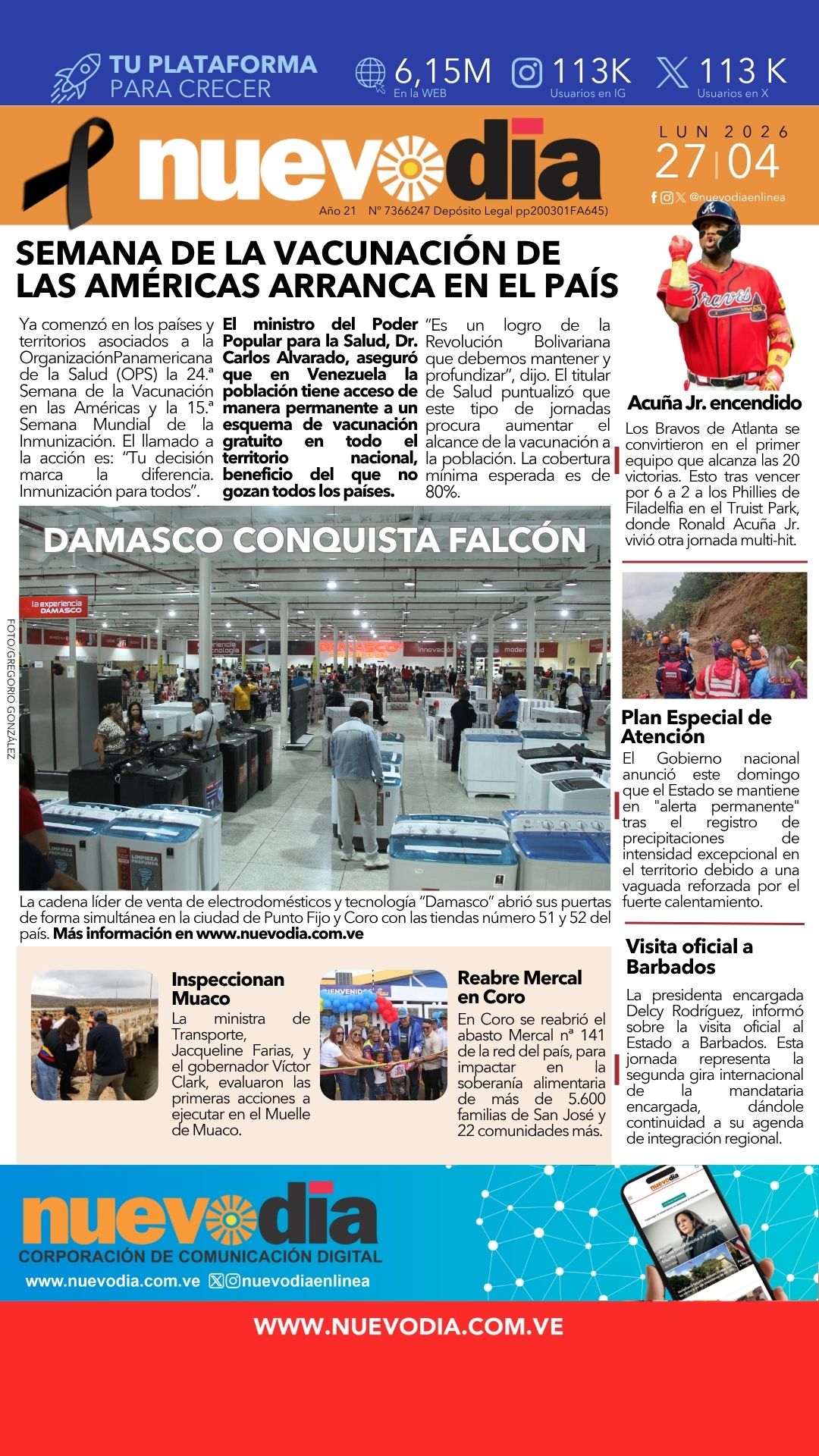 InicioPortadas Portadas Primera del 27 de abril de 2026 27/04/2026 FacebookTwitterPinterestWhatsApp Cuota FacebookTwitterPinterestWhatsApp Artículo anteriorAutoridades nacionales y regionales inspeccionan muelle de Muaco Josmary EscalonaPeriodista principalmente de la fuente política que también hace diarismo, entrevistas y trabajos especiales sobre temas que la población desea conocer. Noticias Relacionadas Portadas Portada viernes 24 de abril de 2026 Portadas Primera 23 de abril de 2026 Portadas Portada miércoles 22 de abril de 2026 Redes Sociales20,299FansMe gusta112,425SeguidoresSeguir4,600SuscriptoresSuscribirte Últimas noticias Destacadas Rechazan fin de la Ley de Amnistía anunciado por Rodríguez Destacadas Así transcurrió la reunión entre Delcy Rodríguez y Petro (FOTOS) Cargar más