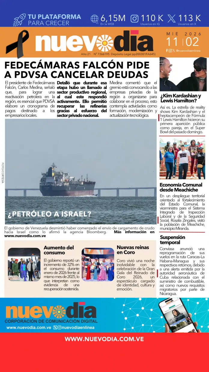 InicioPortadas Portadas Primera miércoles 11 de febrero de 2026 11/02/2026 FacebookTwitterPinterestWhatsApp Cuota FacebookTwitterPinterestWhatsApp Artículo anteriorJosé Alguacil despedido como mánager del CaracasArtículo siguienteAsí está el precio del dólar hoy 11-Feb Laura ArismendiEl periodismo...mi forma de vida. Noticias Relacionadas Portadas Portada martes 3 de marzo de 2026 Portadas Portada sábado 28 de febrero de 2026 Portadas Primera del 27 de febrero de 2026 Redes Sociales20,299FansMe gusta112,425SeguidoresSeguir4,600SuscriptoresSuscribirte Últimas noticias Destacadas Cendas-FVM ubica la canasta alimentaria de enero en 677 dólares Destacadas PDVSA firma nuevos contratos para enviar petróleo a EE.UU. Cargar más