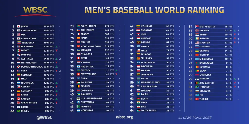El ranking WBSC, que mide el rendimiento acumulado durante los últimos cuatro años en competencias internacionales y continentales de diversas categorías, fue actualizado recientemente para reflejar los resultados del Clásico Mundial 2026, reemplazando los puntos de la edición anterior.