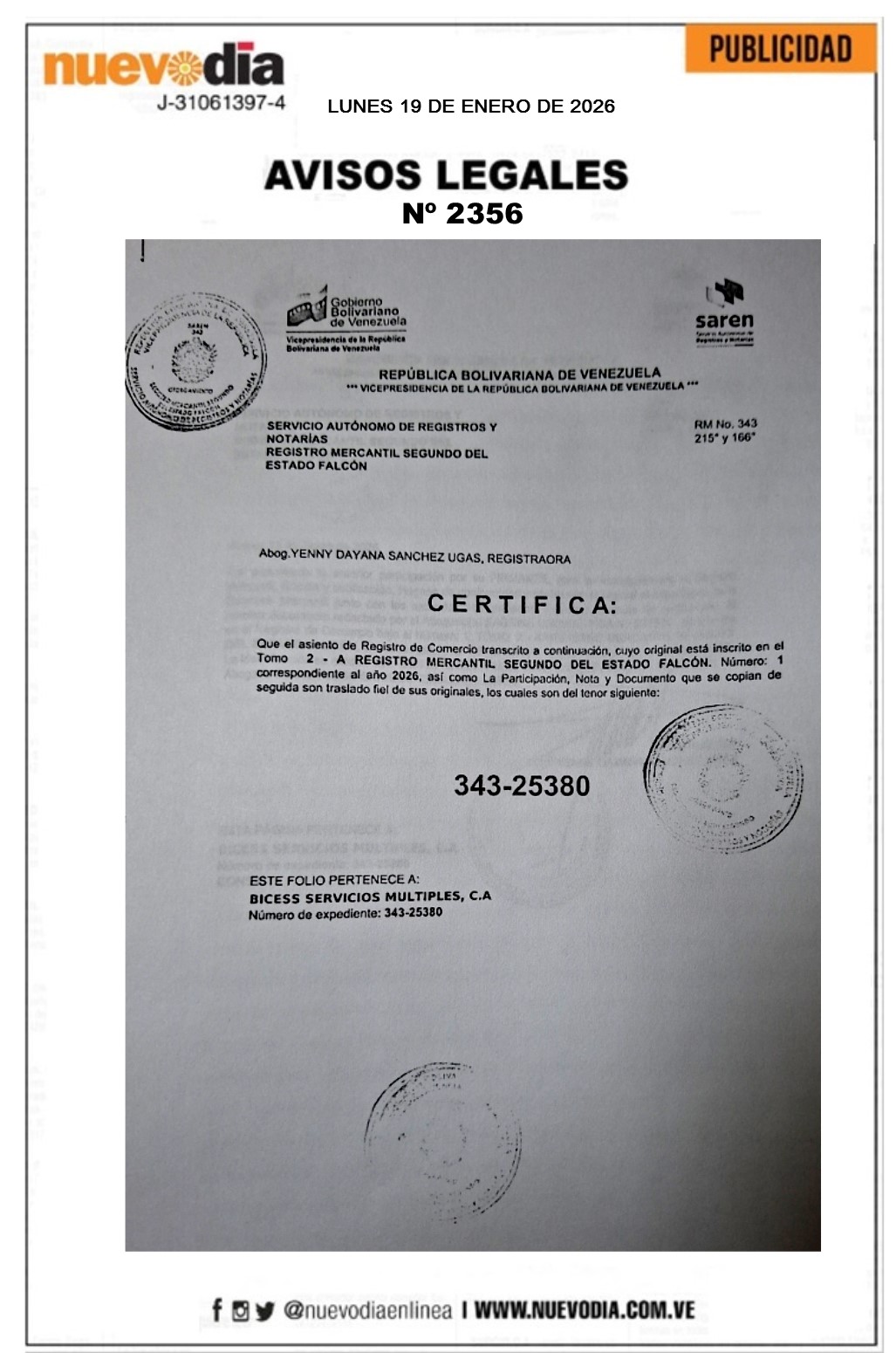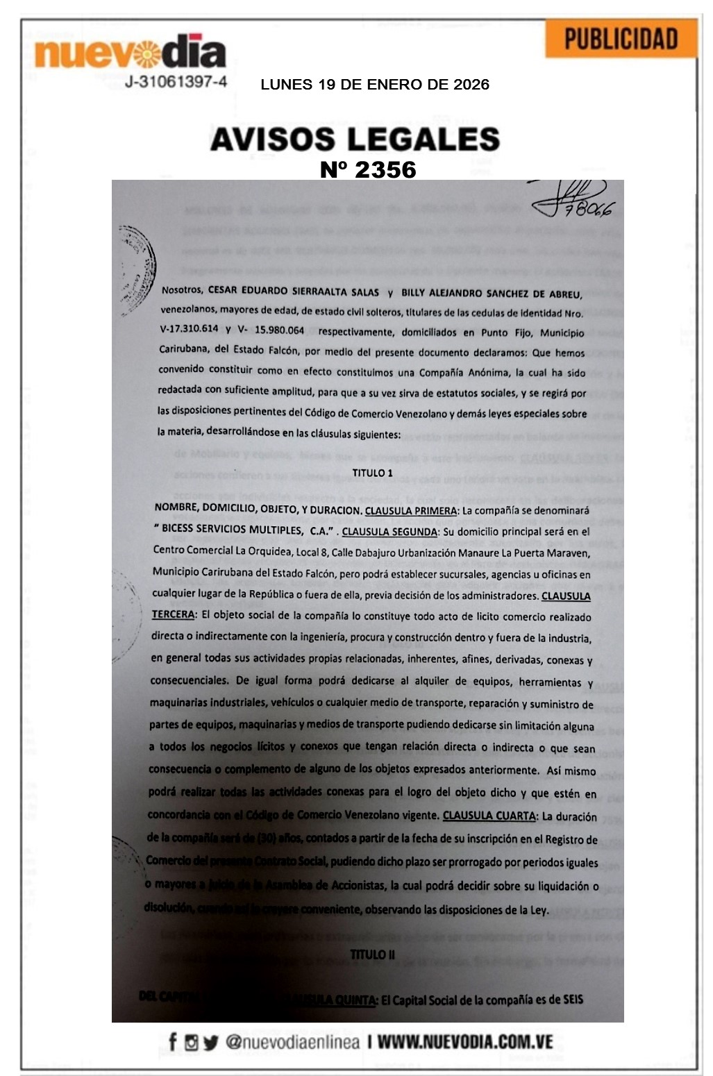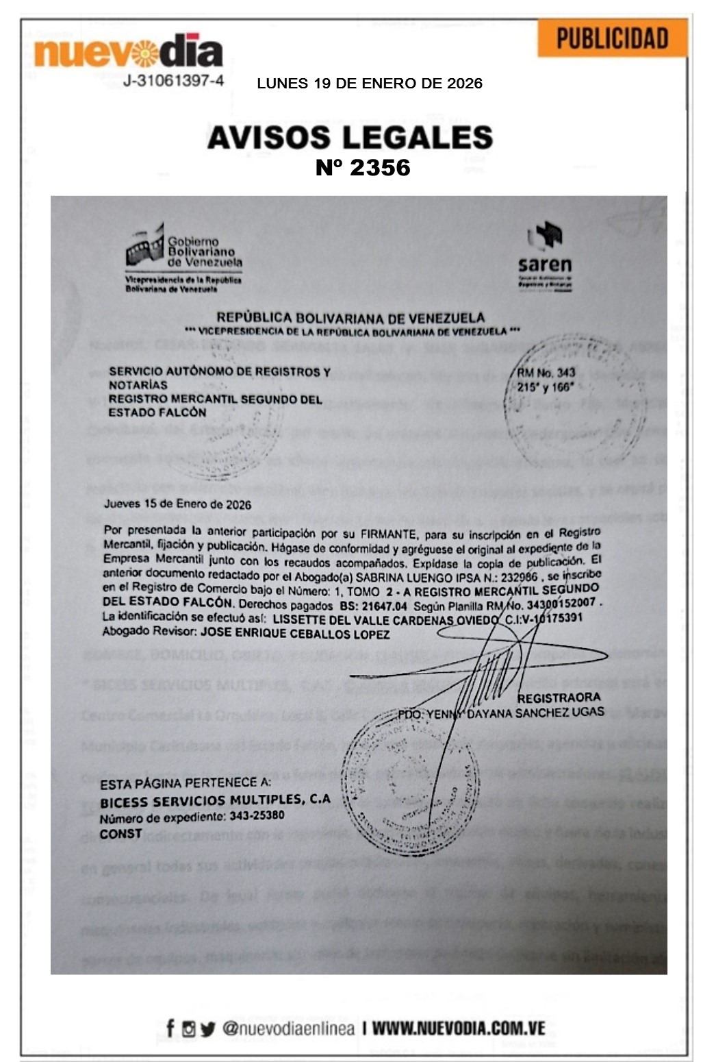 InicioSin categoria Sin categoria Registro Mercantil.Bicess Servicios Multiples.C.A. 19/01/2026 FacebookTwitterPinterestWhatsApp 2356. 19-01-2026 Cuota FacebookTwitterPinterestWhatsApp Artículo anteriorRound Robin de la LVBP arranca semana decisivaArtículo siguienteChile declara estado de catástrofe por incendios forestales Mercadeo NuevoDia Noticias Relacionadas Sin categoria Pescadores debatieron propuestas para elevar al Poder Constituyente Sin categoria Edicto.José Gregorio Loyo Leal. Destacadas EE. UU. impone sanciones al comercio de armas entre Irán y Venezuela Redes Sociales20,299FansMe gusta112,425SeguidoresSeguir4,600SuscriptoresSuscribirte Últimas noticias Destacadas Cavecom-e reporta crecimiento de la economía digital en 2025 Destacadas AN debatirá con prontitud proyectos de ley presentados por el gobierno Cargar más