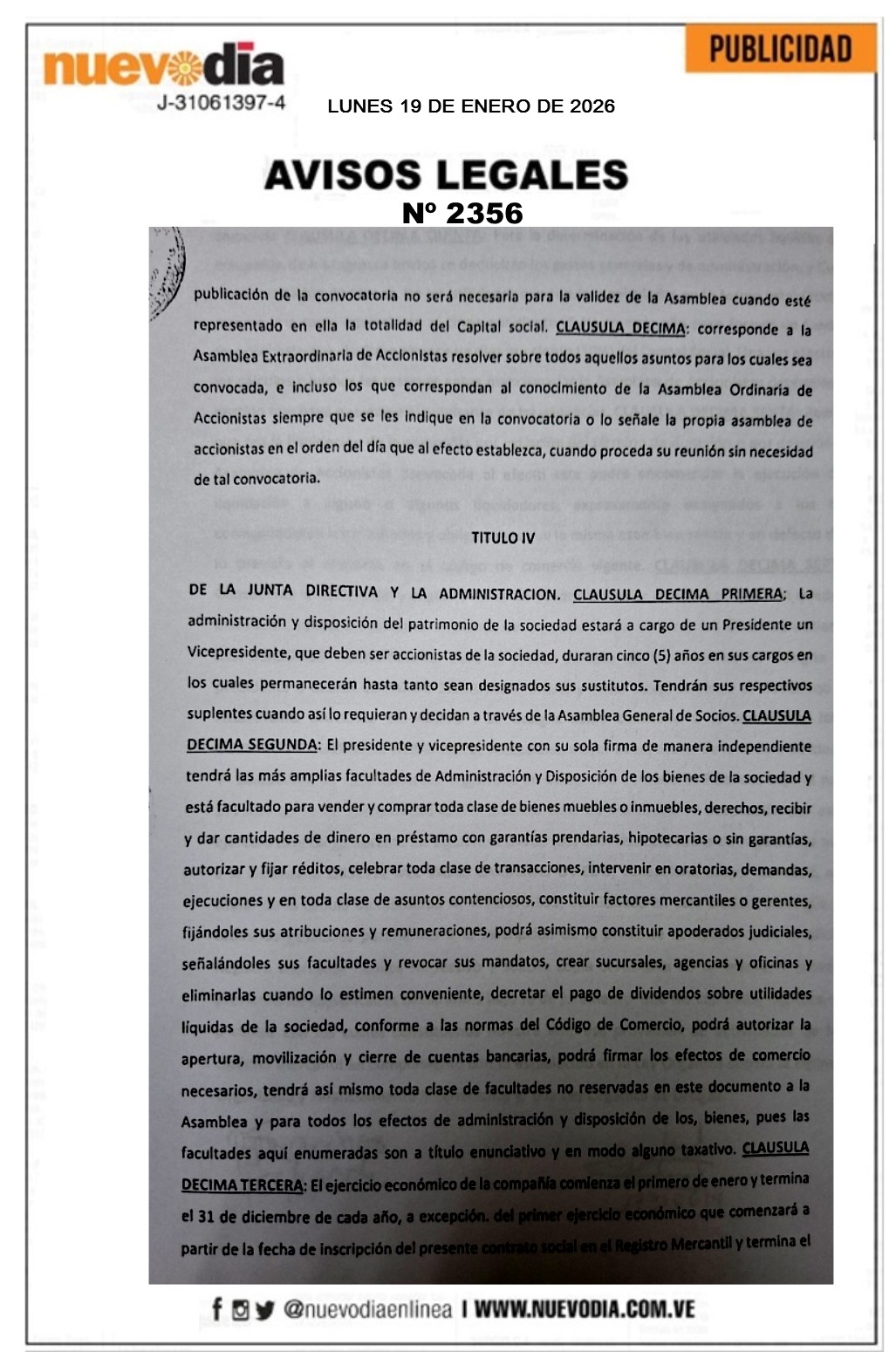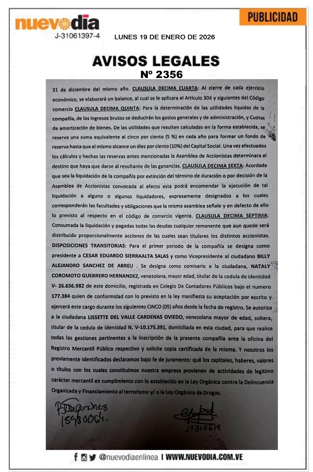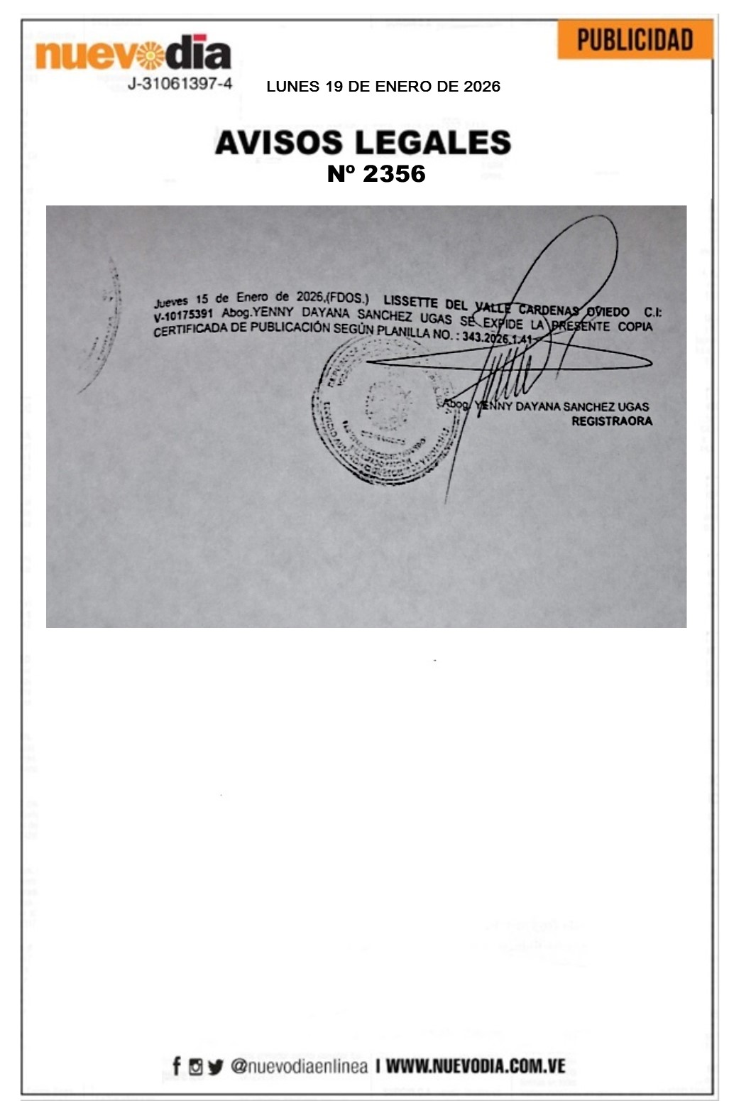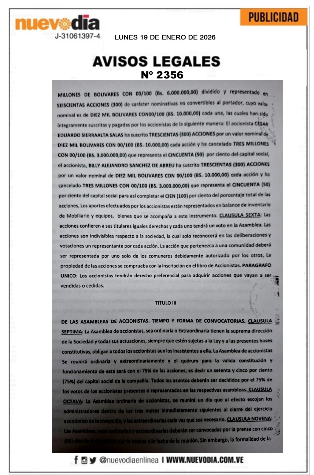 InicioSin categoria Sin categoria Registro Mercantil.Bicess Servicios Multiples.C.A. 19/01/2026 FacebookTwitterPinterestWhatsApp 2356. 19-01-2026 Cuota FacebookTwitterPinterestWhatsApp Artículo anteriorRound Robin de la LVBP arranca semana decisivaArtículo siguienteChile declara estado de catástrofe por incendios forestales Mercadeo NuevoDia Noticias Relacionadas Sin categoria Pescadores debatieron propuestas para elevar al Poder Constituyente Sin categoria Edicto.José Gregorio Loyo Leal. Destacadas EE. UU. impone sanciones al comercio de armas entre Irán y Venezuela Redes Sociales20,299FansMe gusta112,425SeguidoresSeguir4,600SuscriptoresSuscribirte Últimas noticias Destacadas Cavecom-e reporta crecimiento de la economía digital en 2025 Destacadas AN debatirá con prontitud proyectos de ley presentados por el gobierno Cargar más