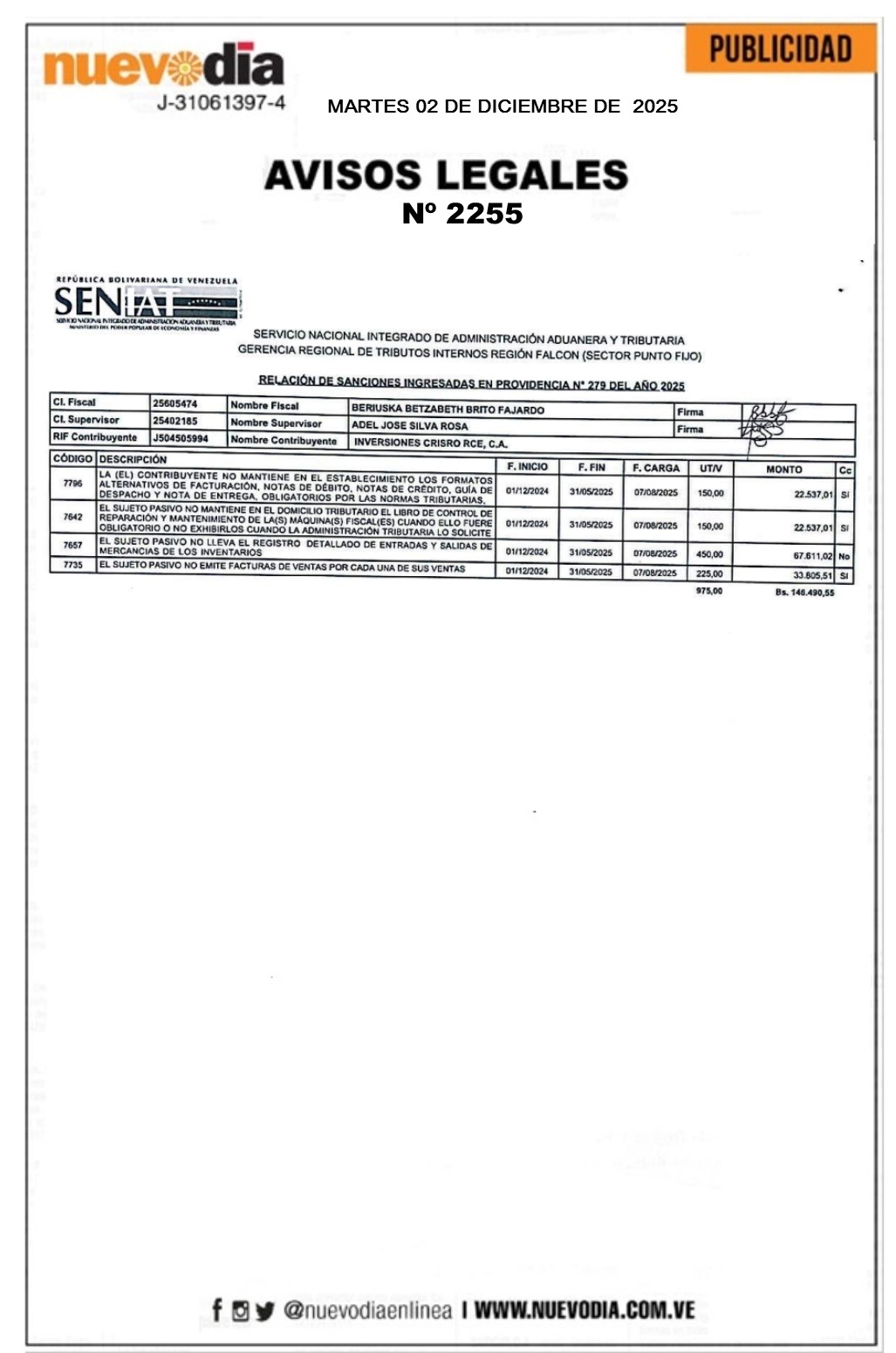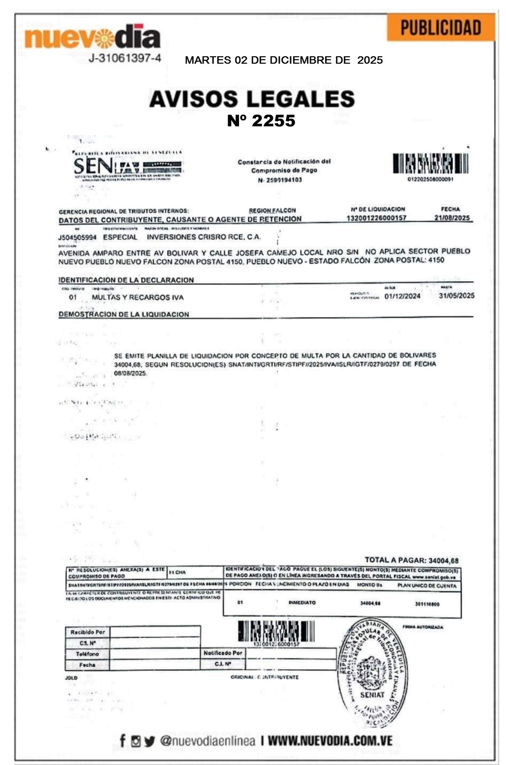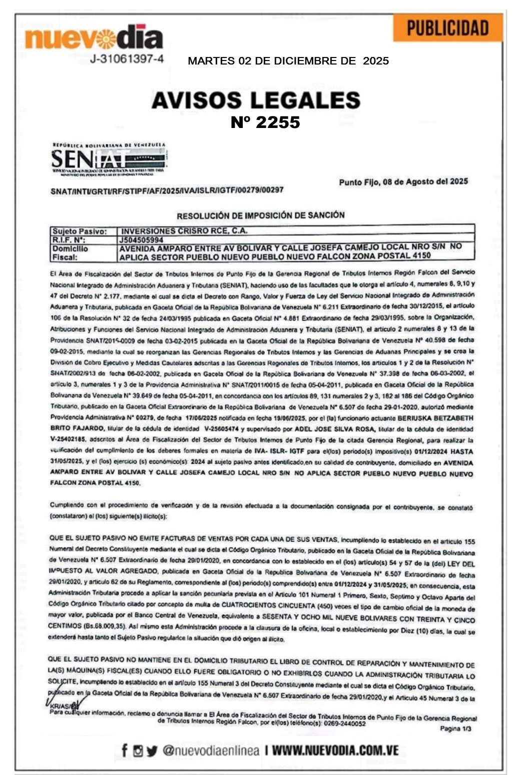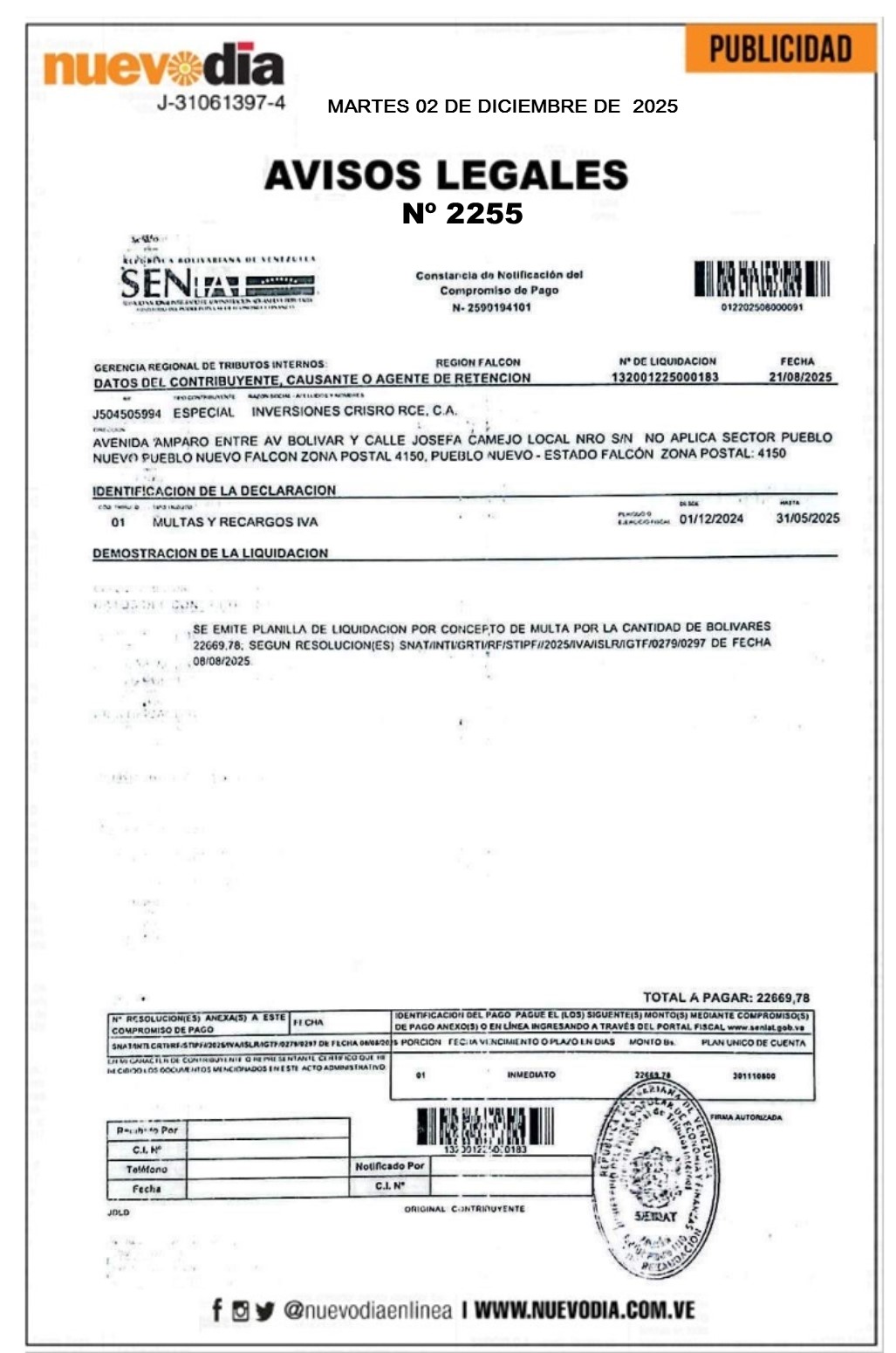 InicioPublicidadLegales PublicidadLegales Resolución de Imposición de Sanción.Inversiones Crisro RCE.C.A. 02/12/2025 FacebookTwitterPinterestWhatsApp 2255. 02-12-2025 Cuota FacebookTwitterPinterestWhatsApp Artículo anteriorInces supera los 800 profesionales formados en el área de Refrigeración y Aire AcondicionadoArtículo siguienteTrump anunciará una importante decisión sobre Venezuela este 2-Dic Mercadeo NuevoDia Noticias Relacionadas Legales Edicto.Nemesio del Carmen Rivero Marrufo. Legales Edicto.José Gregorio Loyo Leal. Legales Edicto.José Vicente Pérez Borjas. Redes Sociales20,299FansMe gusta112,425SeguidoresSeguir4,600SuscriptoresSuscribirte Últimas noticias Destacadas Designación de nuevos líderes PSUV 2025 reconfigura estructura Destacadas Conoce el precio del dólar en Venezuela para hoy 2-Dic Cargar más