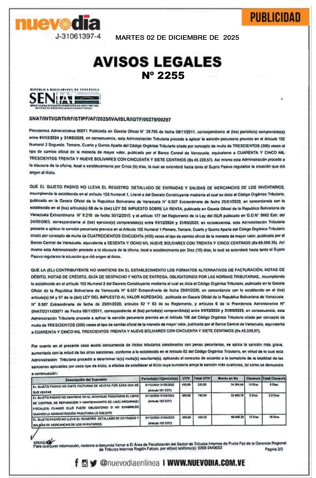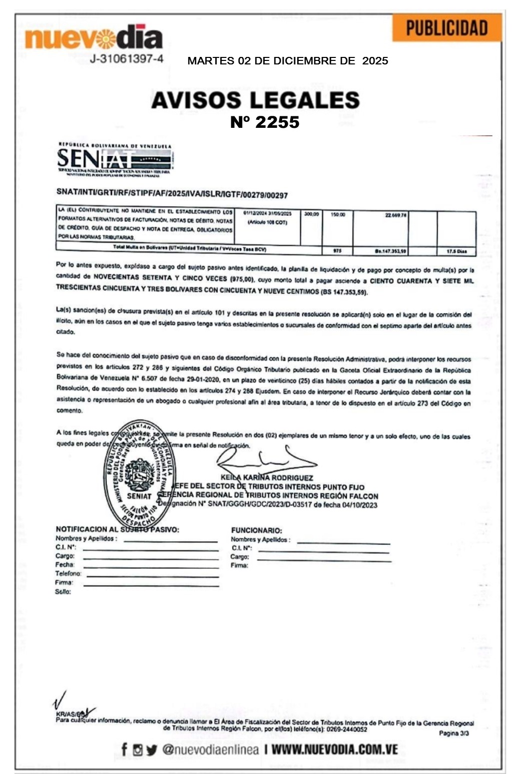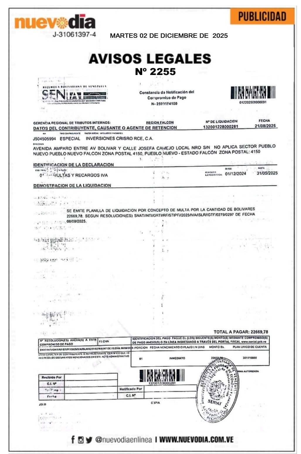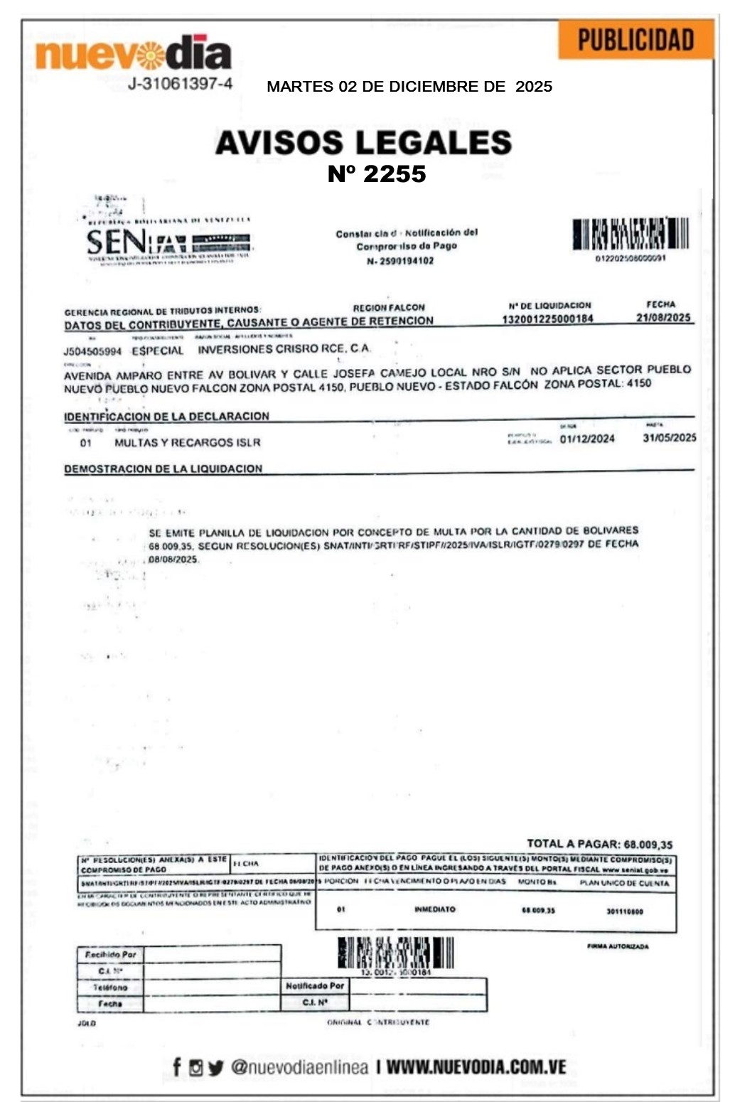 InicioPublicidadLegales PublicidadLegales Resolución de Imposición de Sanción.Inversiones Crisro RCE.C.A. 02/12/2025 FacebookTwitterPinterestWhatsApp 2255. 02-12-2025 Cuota FacebookTwitterPinterestWhatsApp Artículo anteriorInces supera los 800 profesionales formados en el área de Refrigeración y Aire AcondicionadoArtículo siguienteTrump anunciará una importante decisión sobre Venezuela este 2-Dic Mercadeo NuevoDia Noticias Relacionadas Legales Edicto.Nemesio del Carmen Rivero Marrufo. Legales Edicto.José Gregorio Loyo Leal. Legales Edicto.José Vicente Pérez Borjas. Redes Sociales20,299FansMe gusta112,425SeguidoresSeguir4,600SuscriptoresSuscribirte Últimas noticias Destacadas Designación de nuevos líderes PSUV 2025 reconfigura estructura Destacadas Conoce el precio del dólar en Venezuela para hoy 2-Dic Cargar más