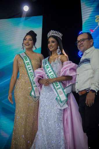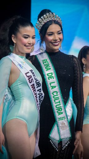 La emoción crecía con cada salida de las candidatas; la autopresentación dio paso a la pasarela en traje de baño. Fue el momento para entregar las primeras bandas de la noche.