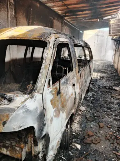 El incendio dejó al vehículo y la estructura de la iglesia totalmente quemada.