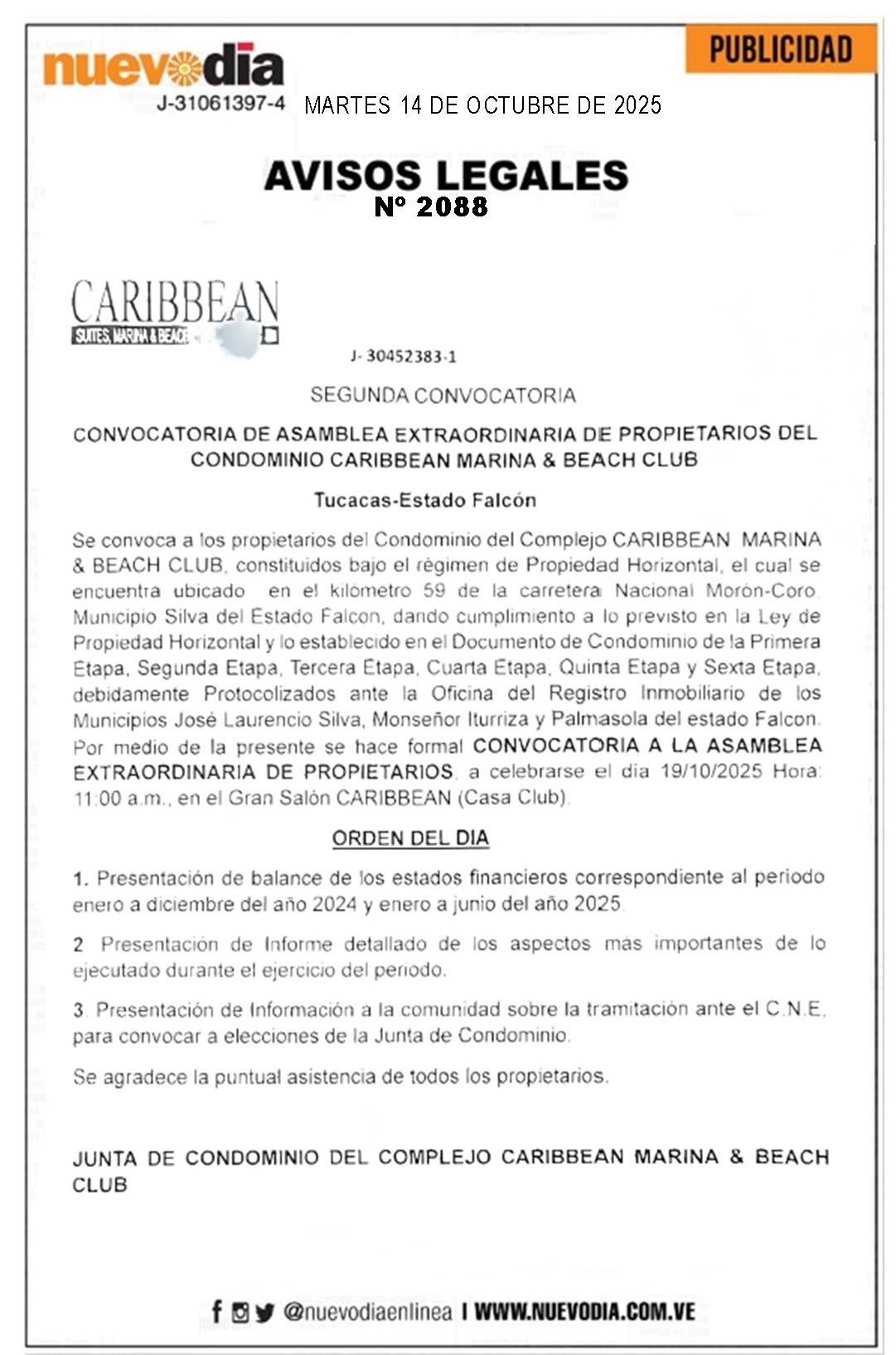 InicioPublicidadLegales PublicidadLegales Segunda Convocatoria.Propietarios del Condominio Complejo Caribbean Marina & Beach Club. 14/10/2025 FacebookTwitterPinterestWhatsApp 2088. 14-10-2025 Cuota FacebookTwitterPinterestWhatsApp Artículo anteriorVenezuela aumenta producción petrolera a 1.105.000 bpd en septiembreArtículo siguienteEdicto.Rosa Margarita Sánchez de Jiménez. Mercadeo NuevoDia Noticias Relacionadas Legales Edicto.Domingo García Ruíz. Legales Edicto.Rosa Margarita Sánchez de Jiménez. Legales Edicto. José Vicente Pérez Borjas. Redes Sociales20,299FansMe gusta112,425SeguidoresSeguir4,600SuscriptoresSuscribirte Últimas noticias Destacadas Venezuela aumenta producción petrolera a 1.105.000 bpd en septiembre Destacadas Vaticano devela imagen de JGH y madre Carmen previo a la canonización (FOTOS) Cargar más