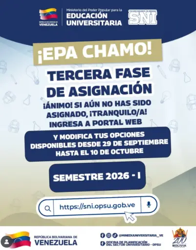 El Ministerio de Educación Universitaria anunció que desde el lunes 29 de septiembre, y hasta el 10 de octubre, se lleva a cabo la tercera etapa del proceso de asignación de cupos universitarios. Esto a través del Sistema Nacional de Ingreso (SNI), gestionado por la Oficina de Planificación del Sector Universitario (OPSU).