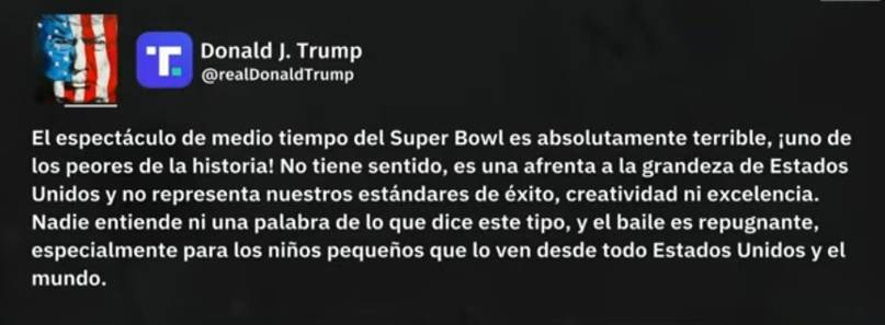Tras el espectáculo, Donald Trump utilizó su red social Truth Social para criticar la actuación de Bad Bunny, calificándola como “absolutamente terrible” y una de las peores en la historia del Super Bowl.
