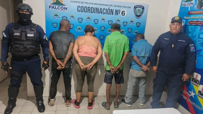 La noche se este lunes efectivos de la Policía de Falcón capturaron a cuatro personas entre ellos una mujer por riña en Pueblo Nuevo, municipio Falcón. Acción que generó alteración del orden público y faltas a la moral.