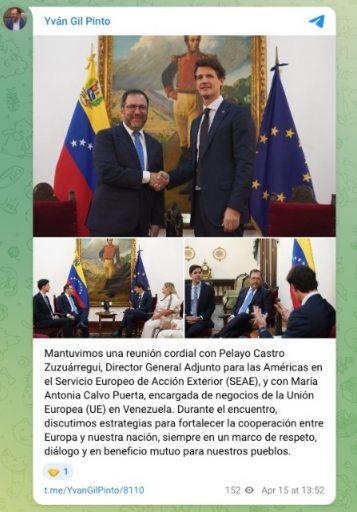 «Mantuvimos una reunión cordial con Pelayo Castro Zuzuárregui, Director General Adjunto para las Américas en el Servicio Europeo de Acción Exterior (SEAE), y con María Antonia Calvo Puerta, encargada de negocios de la Unión Europea (UE) en Venezuela. Durante el encuentro, discutimos estrategias para fortalecer la cooperación entre Europa y nuestra nación, siempre en un marco de respeto, diálogo y en beneficio mutuo para nuestros pueblos», dijo Gil.